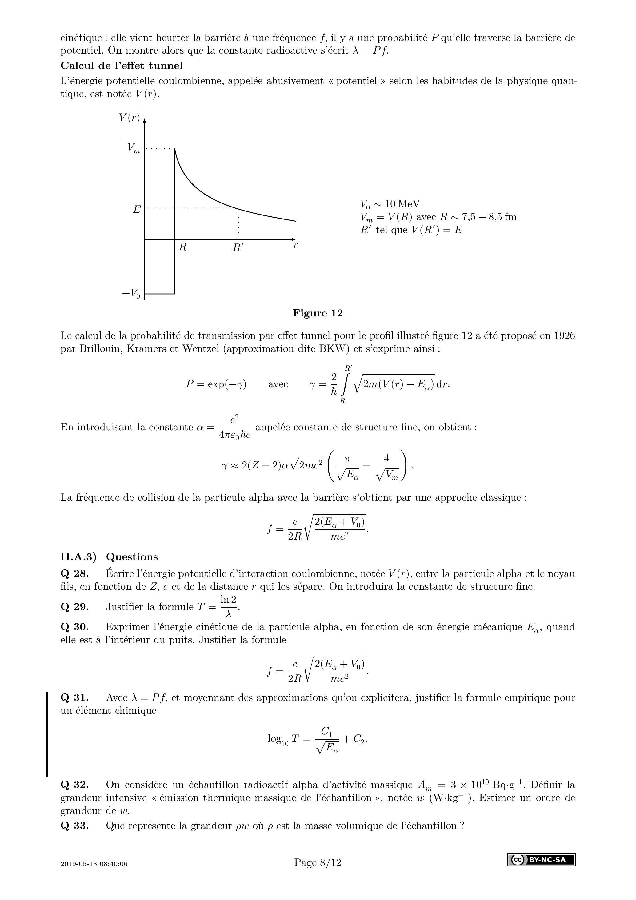 Q 28. Écrire l'énergie potentielle d'interaction coulombienne, notée , entre la particule alpha et le noyau fils, en fonction de et de la distance qui les sépare. On introduira la constante de structure fine.