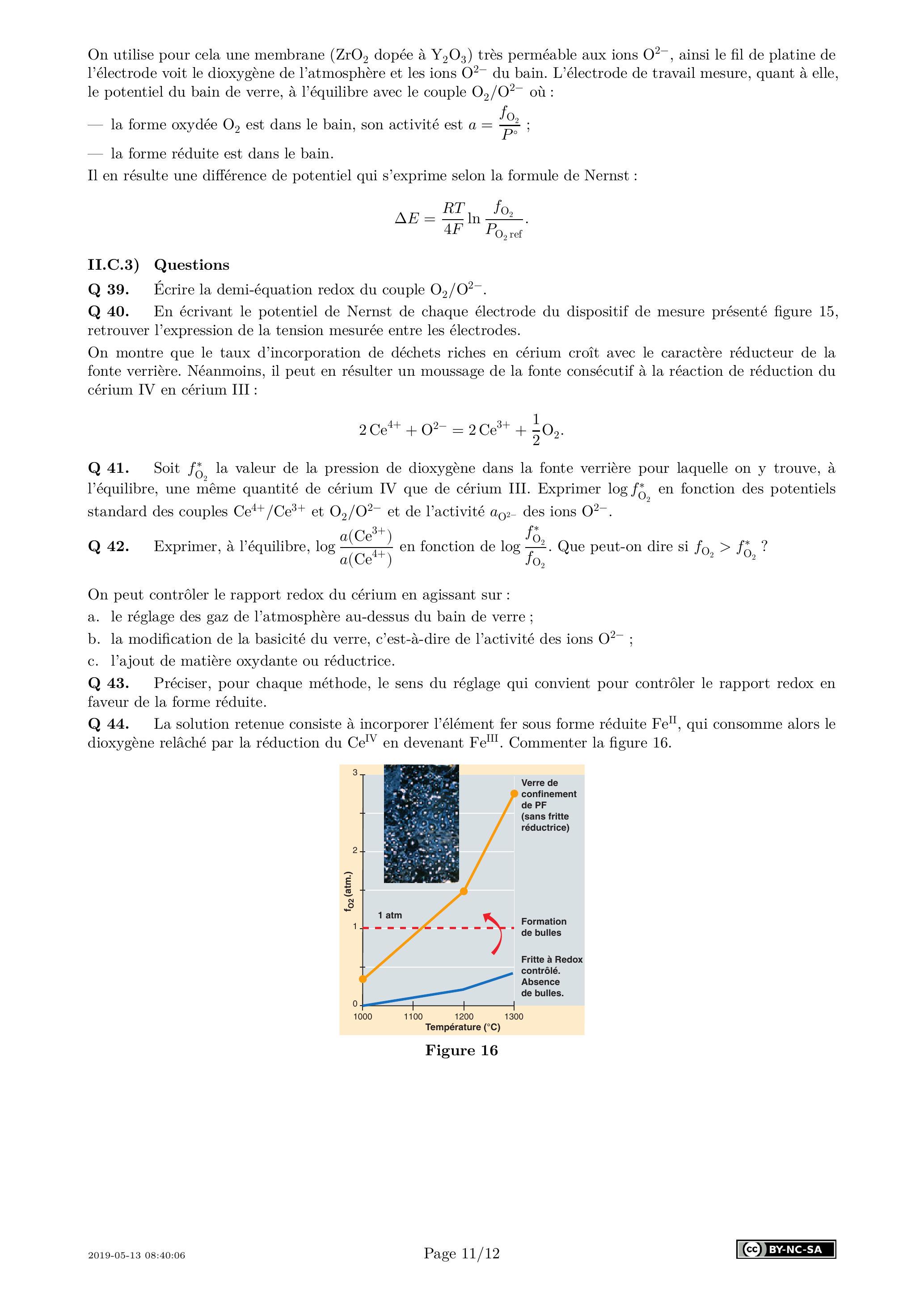 Q 41. Soit la valeur de la pression de dioxygène dans la fonte verrière pour laquelle on y trouve, à l'équilibre, une même quantité de cérium IV que de cérium III. Exprimer en fonction des potentiels standard des couples et et de l'activité des ions .