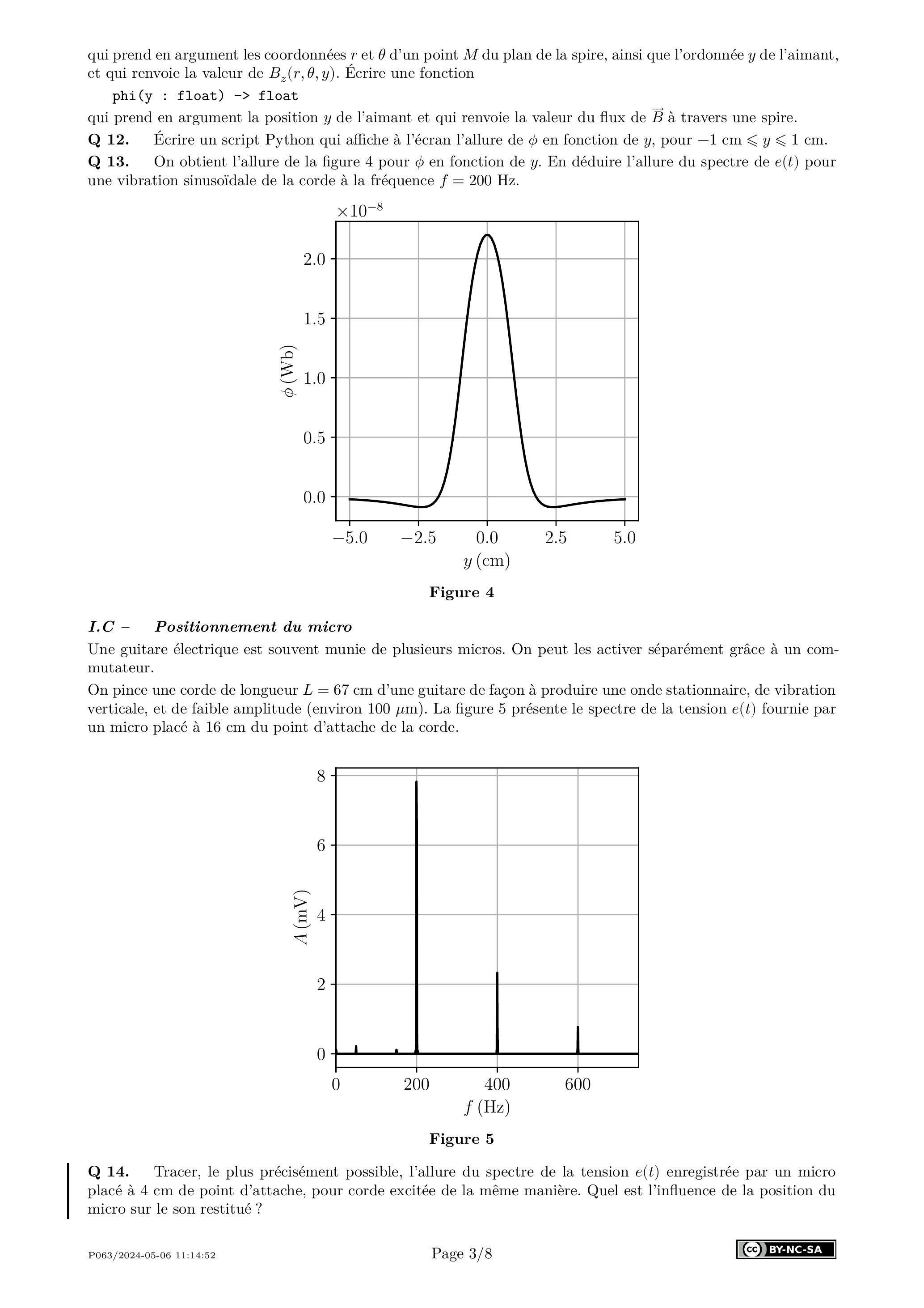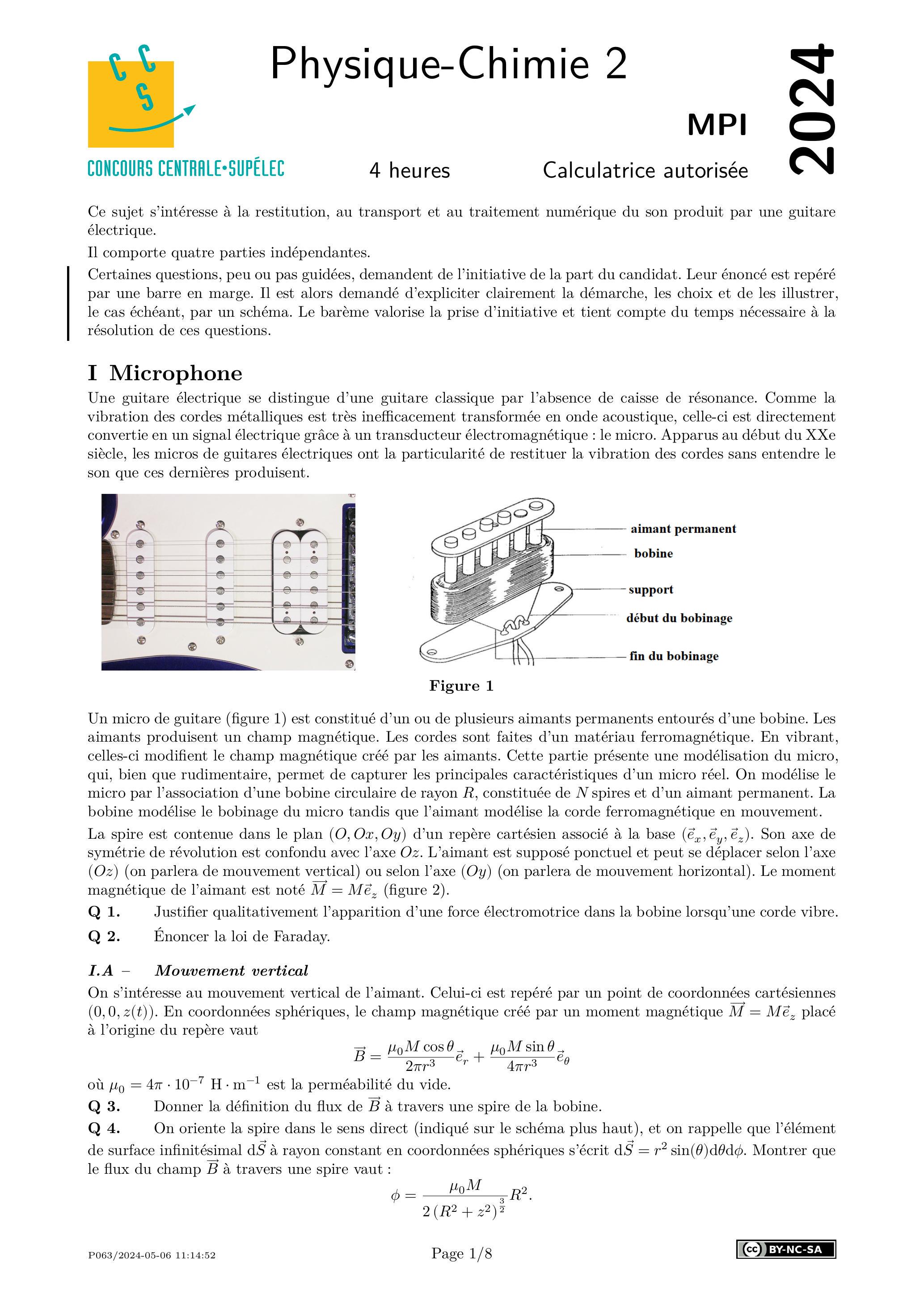 Q 1. Justifier qualitativement l'apparition d'une force électromotrice dans la bobine lorsqu'une corde vibre.