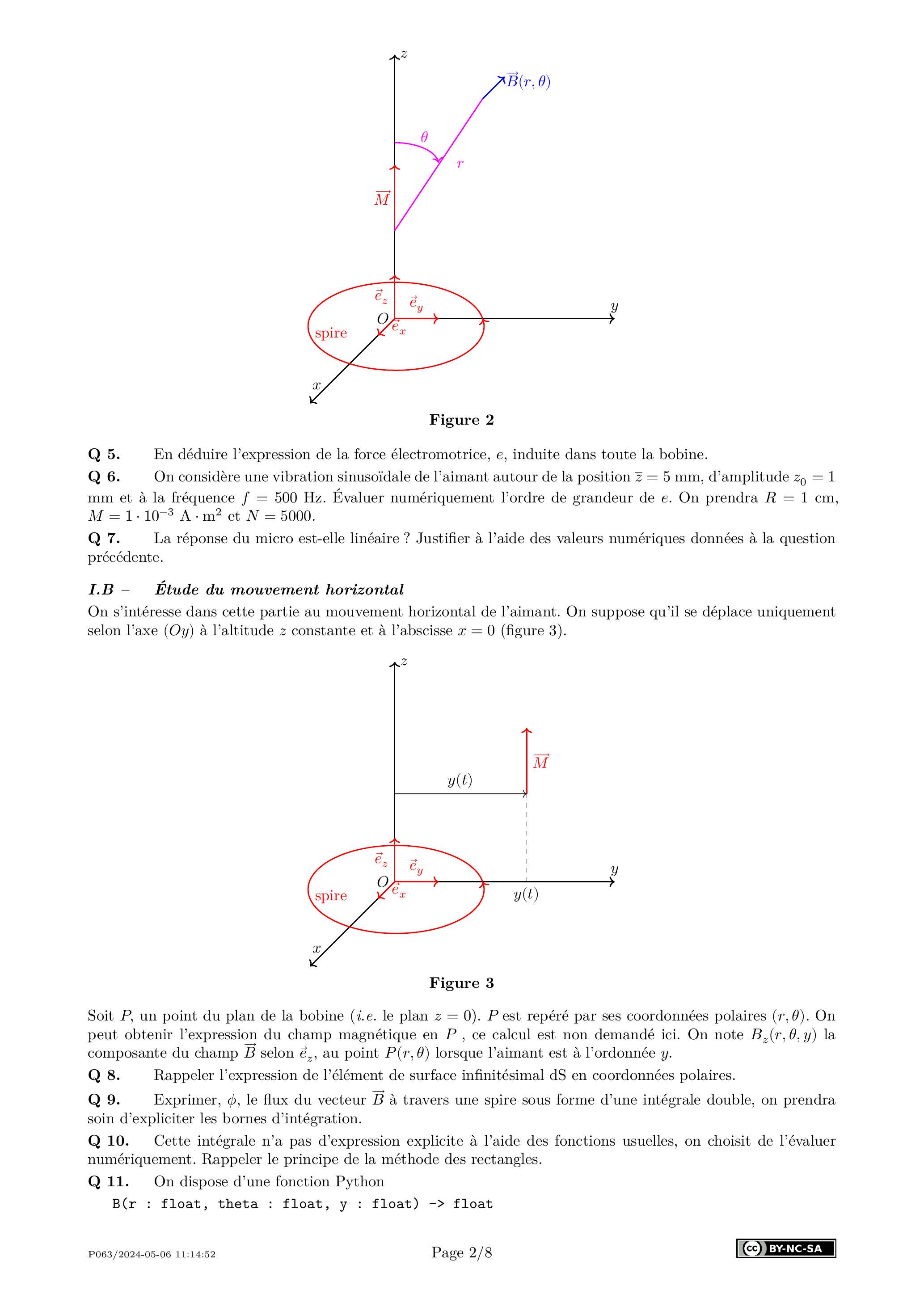 Soit , un point du plan de la bobine (i.e. le plan ). est repéré par ses coordonnées polaires ( ). On peut obtenir l'expression du champ magnétique en , ce calcul est non demandé ici. On note la composante du champ selon , au point lorsque l'aimant est à l'ordonnée .