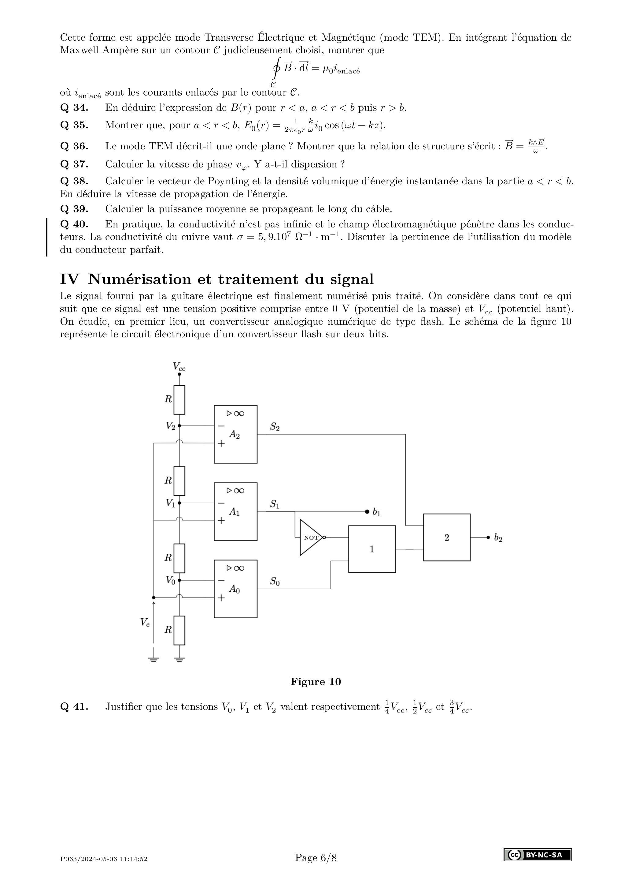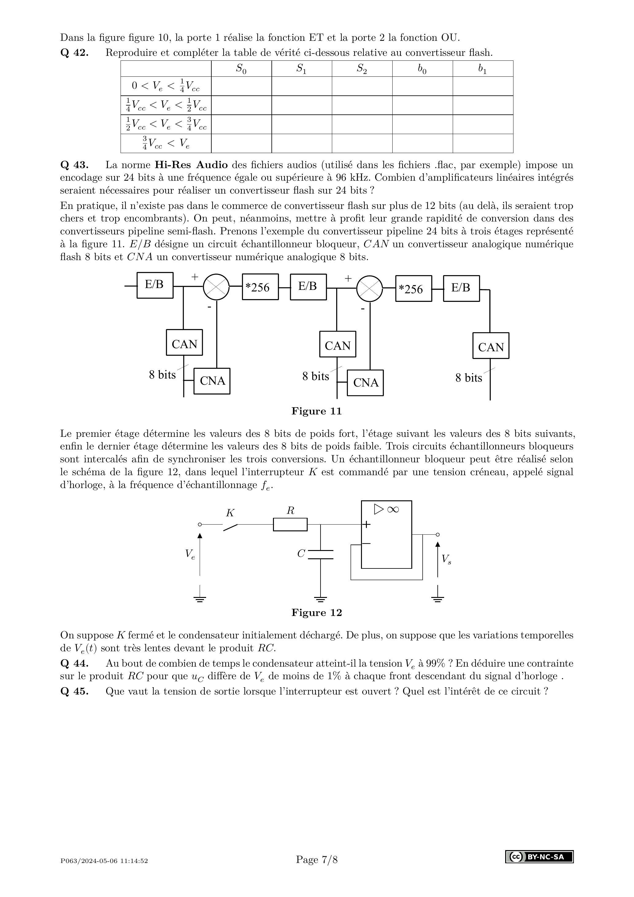Q 43. La norme Hi-Res Audio des fichiers audios (utilisé dans les fichiers .flac, par exemple) impose un encodage sur 24 bits à une fréquence égale ou supérieure à 96 kHz . Combien d'amplificateurs linéaires intégrés seraient nécessaires pour réaliser un convertisseur flash sur 24 bits?