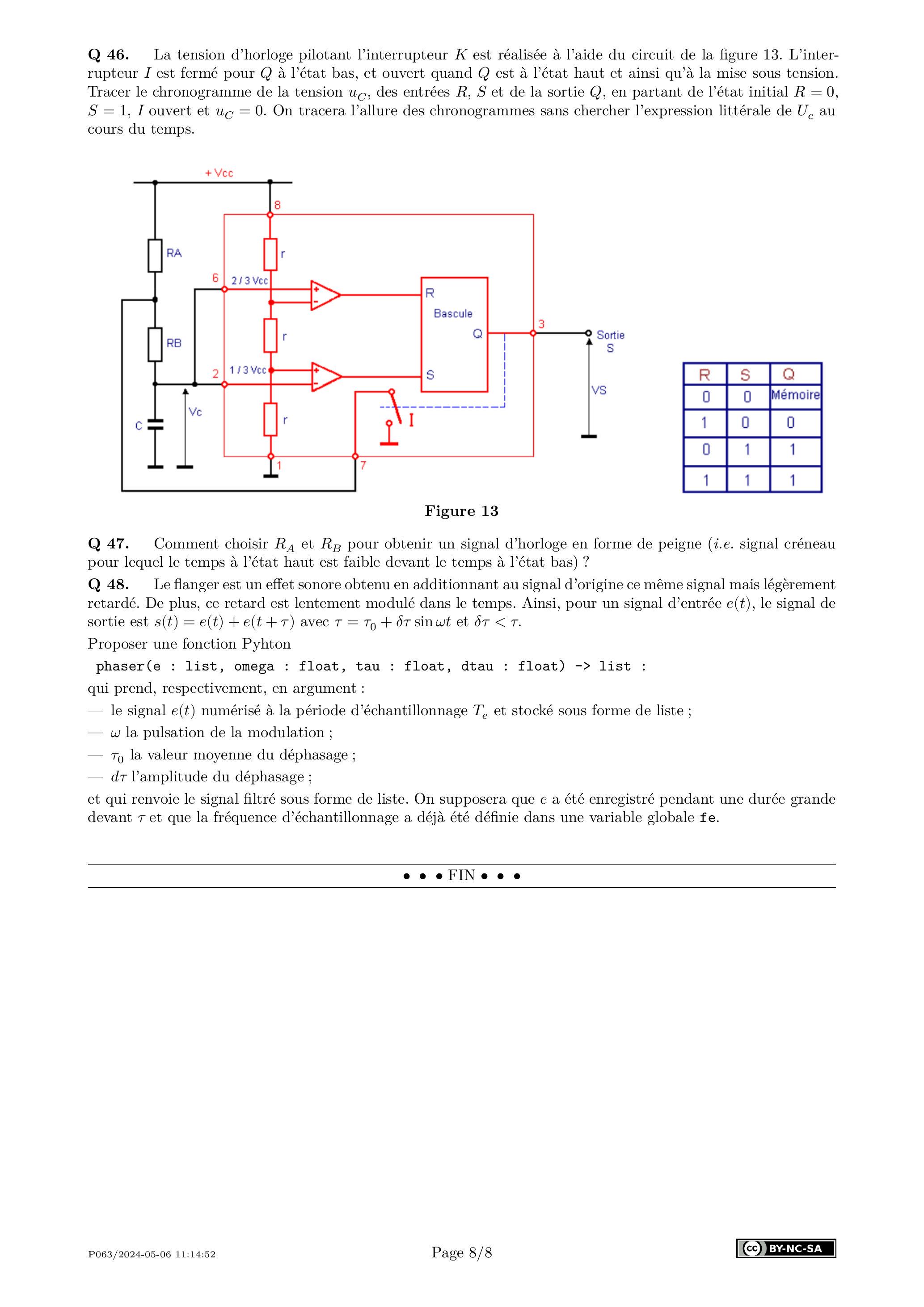 Q 48. Le flanger est un effet sonore obtenu en additionnant au signal d'origine ce même signal mais légèrement retardé. De plus, ce retard est lentement modulé dans le temps. Ainsi, pour un signal d'entrée , le signal de sortie est avec et .