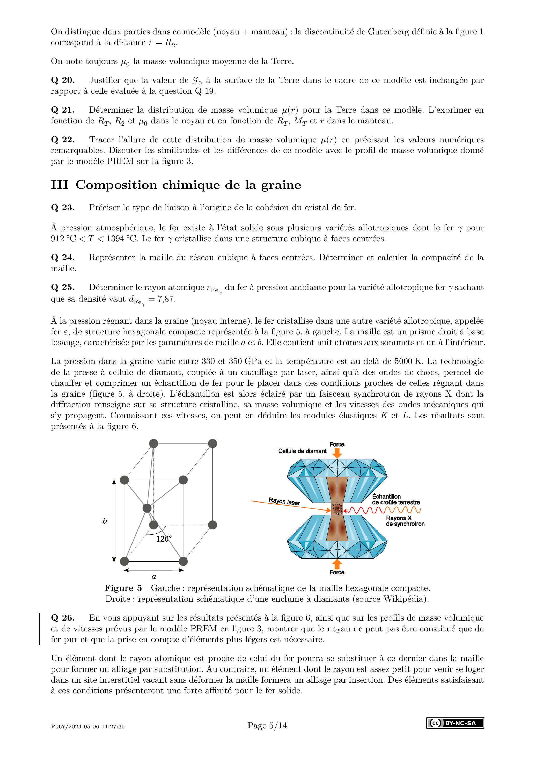 Q 27. Il est communément admis que le noyau est constitué d'environ de fer pur associé à de nickel, les restant étant des éléments plus légers (essentiellement le silicium ( Si ) et l'oxygène ( O )). Montrer que l'hypothèse précédente est en adéquation avec la structure de la maille du fer à haute pression.