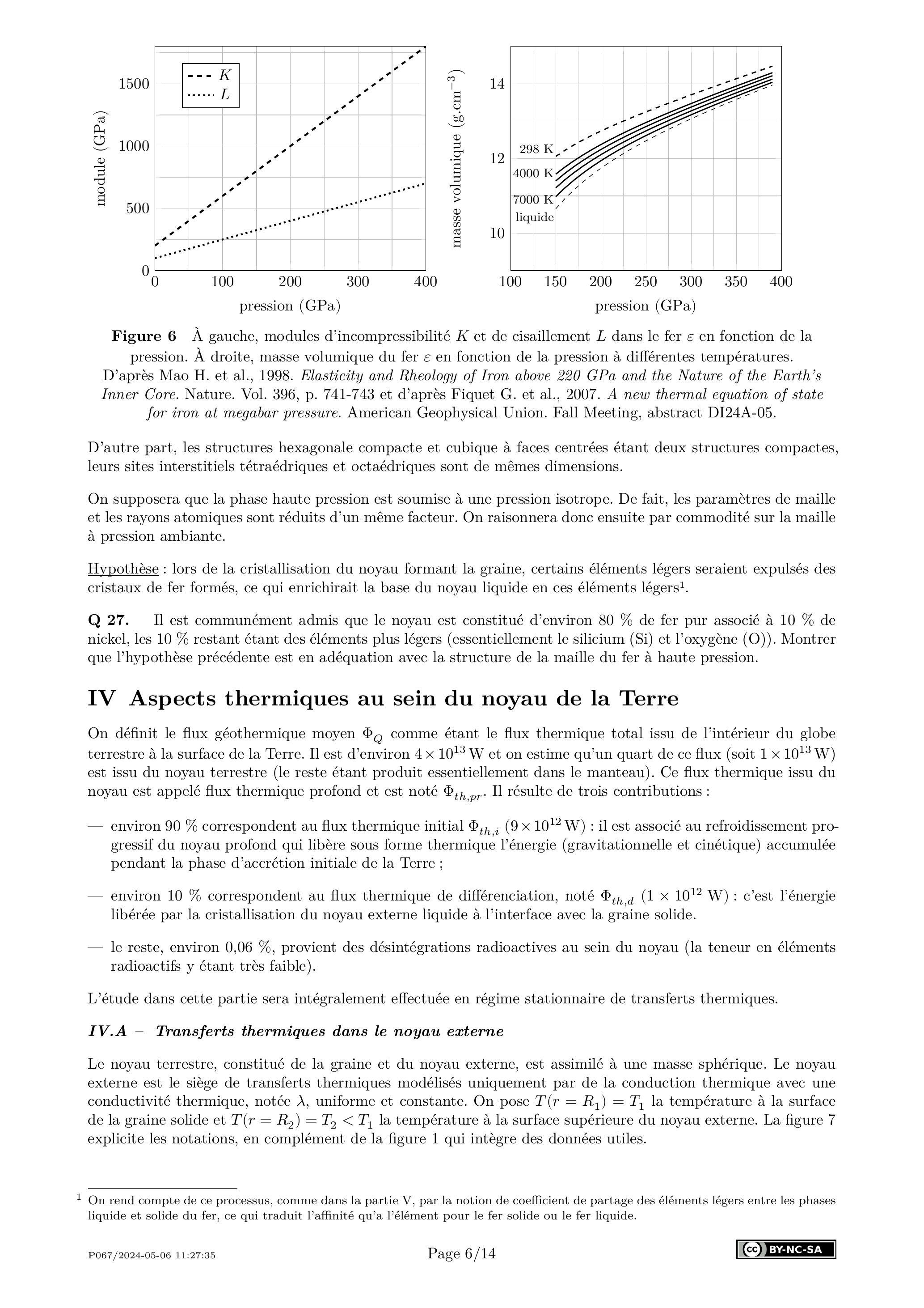 Q 26. En vous appuyant sur les résultats présentés à la figure 6, ainsi que sur les profils de masse volumique et de vitesses prévus par le modèle PREM en figure 3, montrer que le noyau ne peut pas être constitué que de fer pur et que la prise en compte d'éléments plus légers est nécessaire.