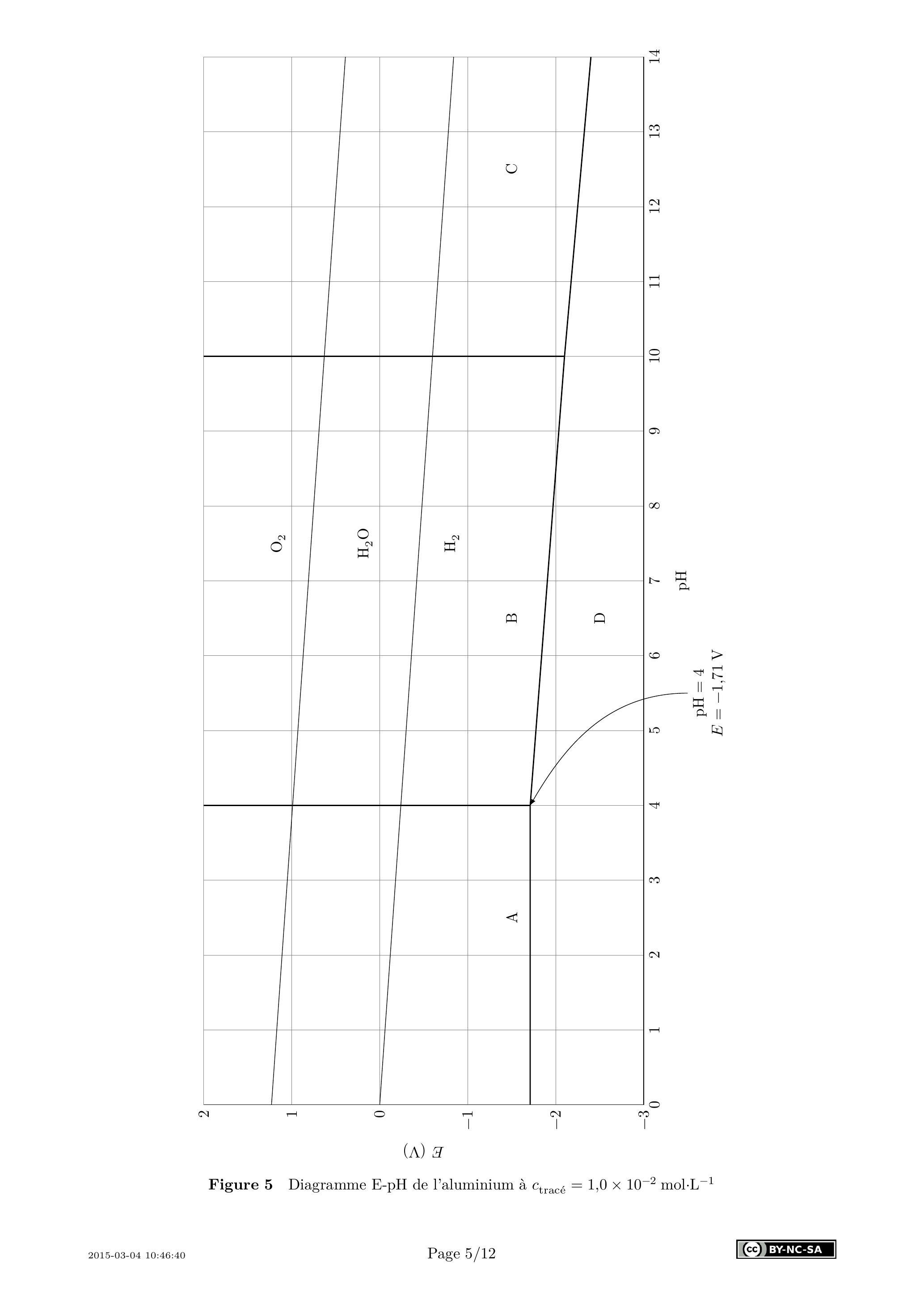 Le diagramme simplifié de l'aluminium a été tracé figure 5 pour une concentration atomique totale en élément aluminium égale à é en se limitant aux espèces et . On a également superposé le diagramme E-pH de l'eau.