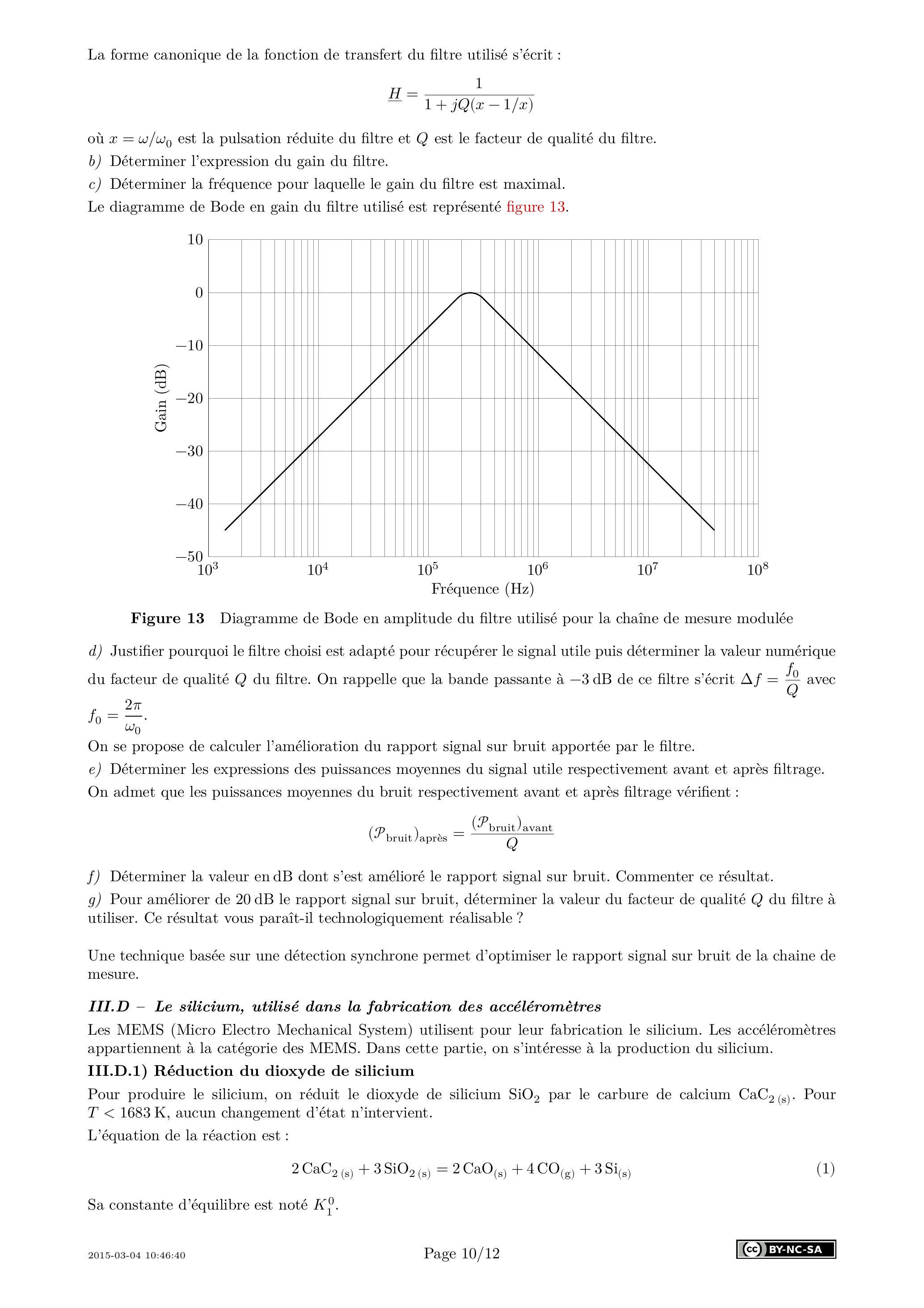 d) Justifier pourquoi le filtre choisi est adapté pour récupérer le signal utile puis déterminer la valeur numérique du facteur de qualité du filtre. On rappelle que la bande passante à -3 dB de ce filtre s'écrit avec .