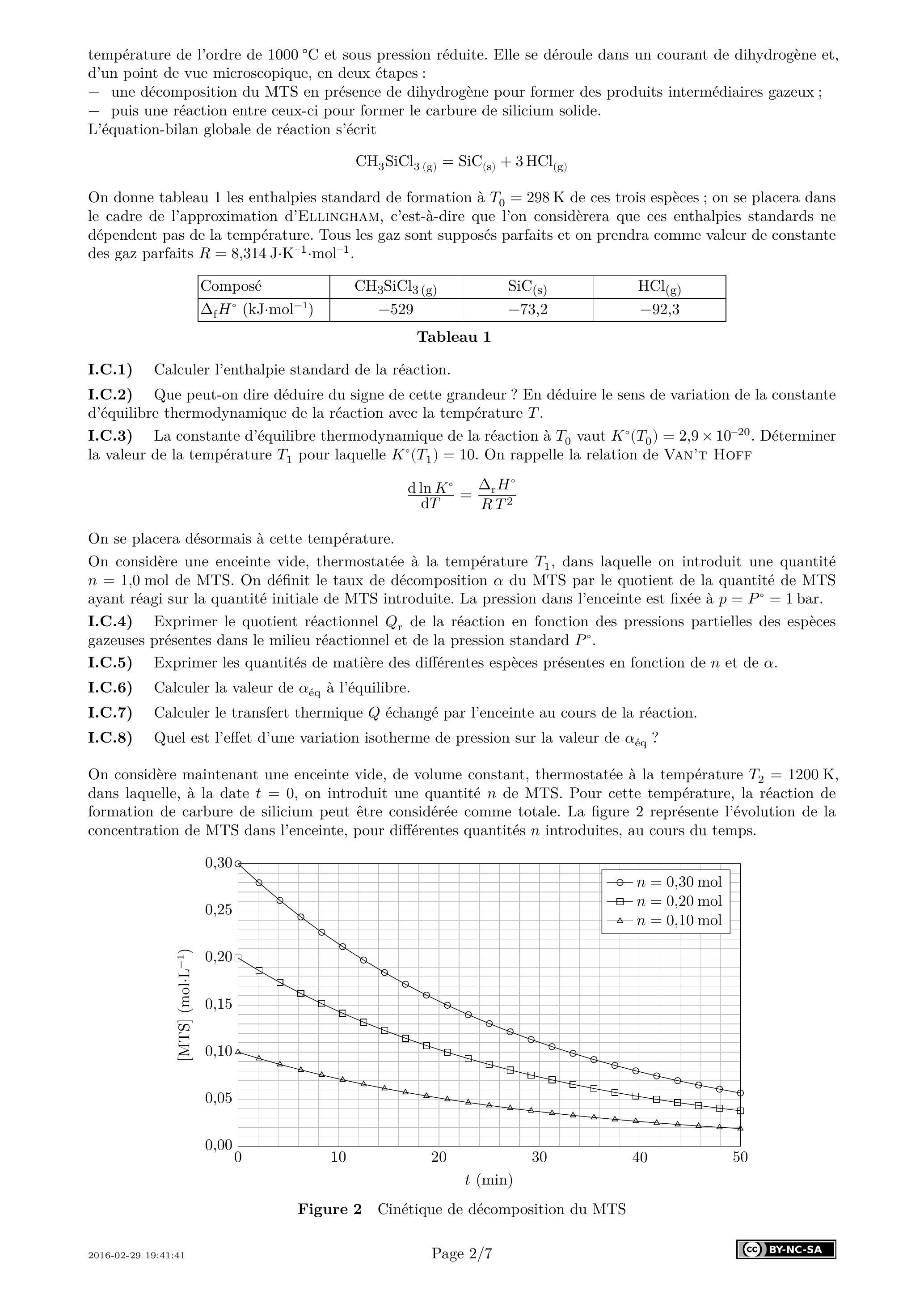 On considère une enceinte vide, thermostatée à la température , dans laquelle on introduit une quantité de MTS. On définit le taux de décomposition du MTS par le quotient de la quantité de MTS ayant réagi sur la quantité initiale de MTS introduite. La pression dans l'enceinte est fixée à bar.