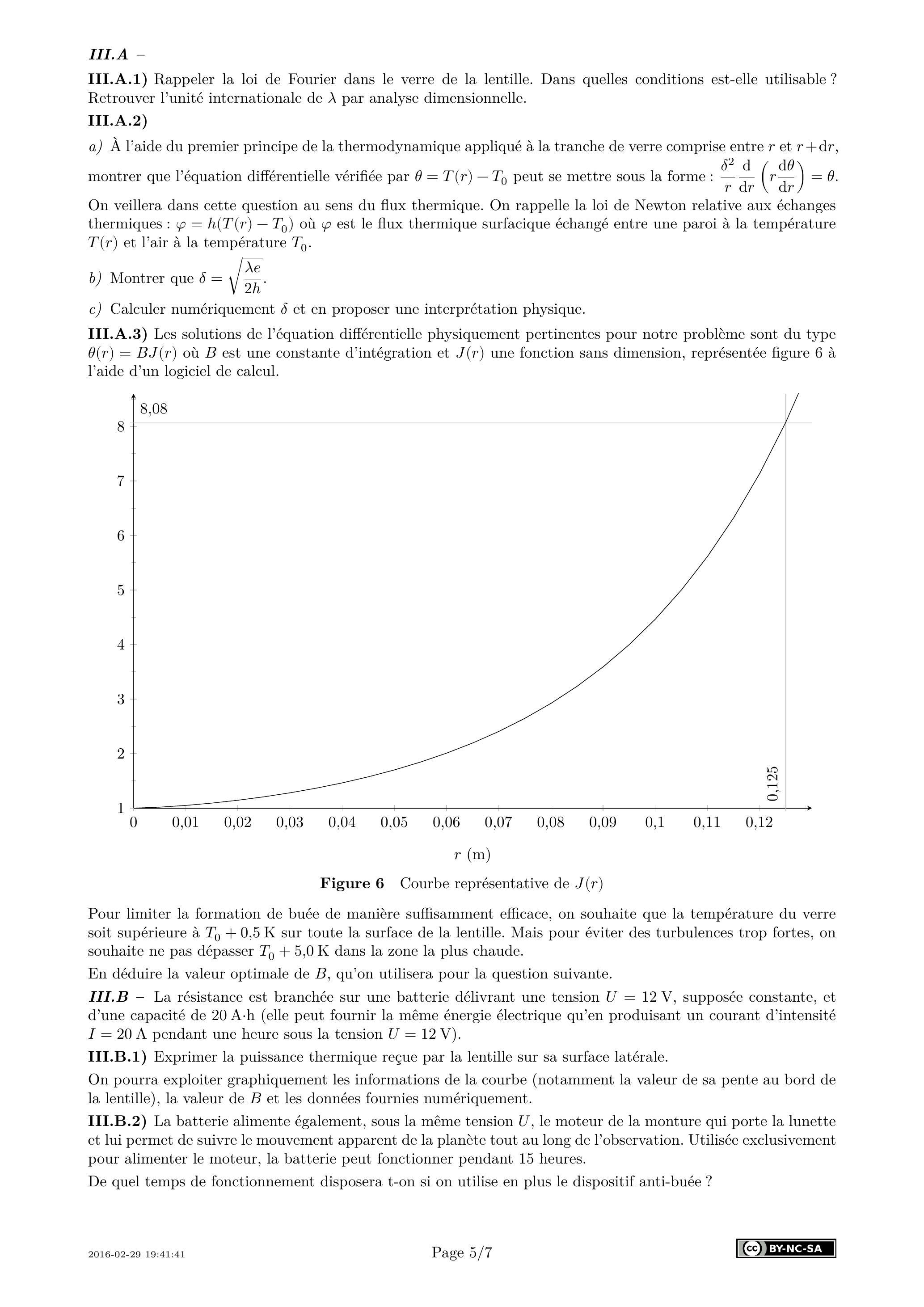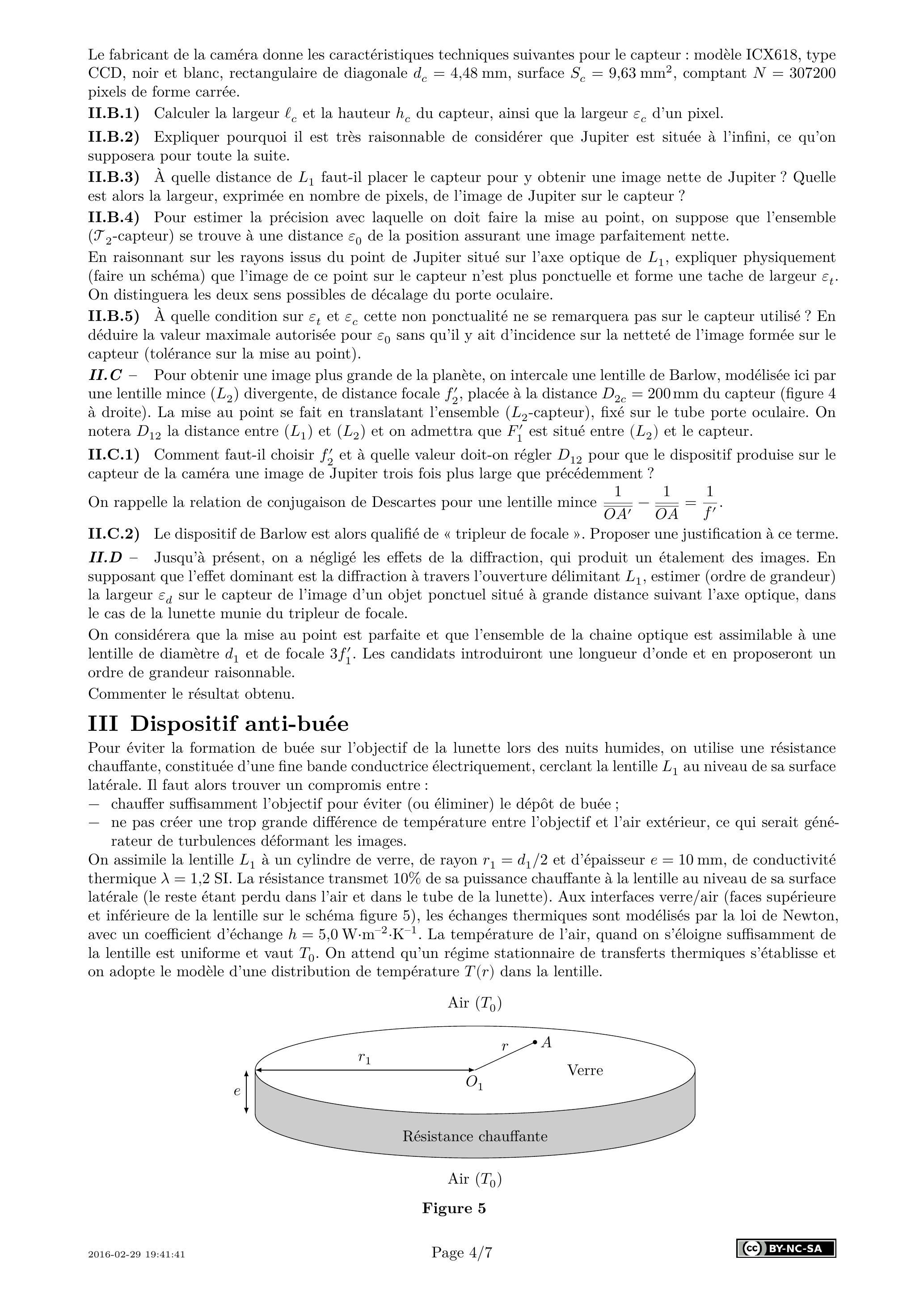 On assimile la lentille à un cylindre de verre, de rayon et d'épaisseur , de conductivité thermique . La résistance transmet de sa puissance chauffante à la lentille au niveau de sa surface latérale (le reste étant perdu dans l'air et dans le tube de la lunette). Aux interfaces verre/air (faces supérieure et inférieure de la lentille sur le schéma figure 5), les échanges thermiques sont modélisés par la loi de Newton, avec un coefficient d'échange . La température de l'air, quand on s'éloigne suffisamment de la lentille est uniforme et vaut . On attend qu'un régime stationnaire de transferts thermiques s'établisse et on adopte le modèle d'une distribution de température dans la lentille.