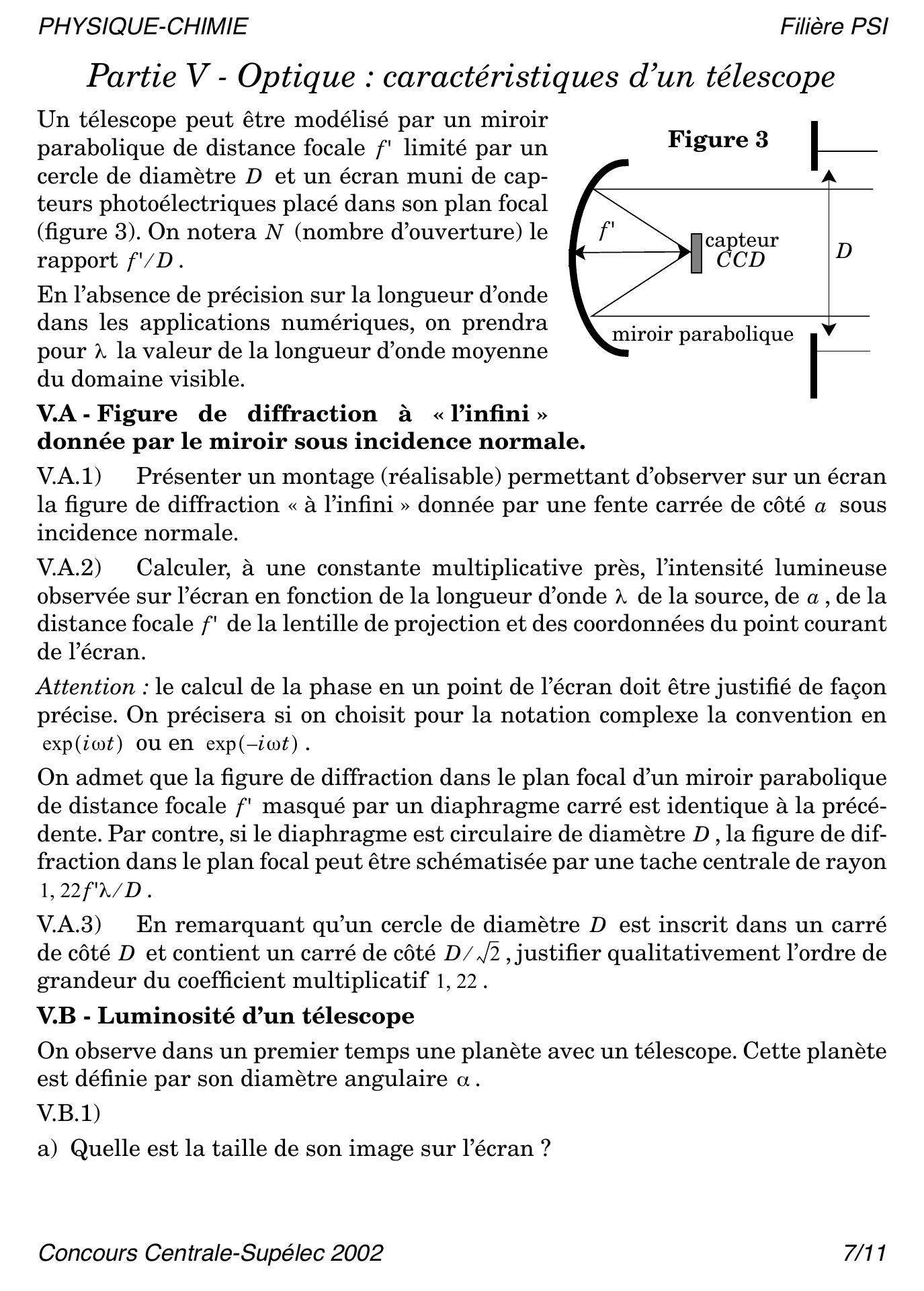 Un télescope peut être modélisé par un miroir parabolique de distance focale limité par un cercle de diamètre et un écran muni de capteurs photoélectriques placé dans son plan focal (figure 3). On notera (nombre d'ouverture) le rapport .