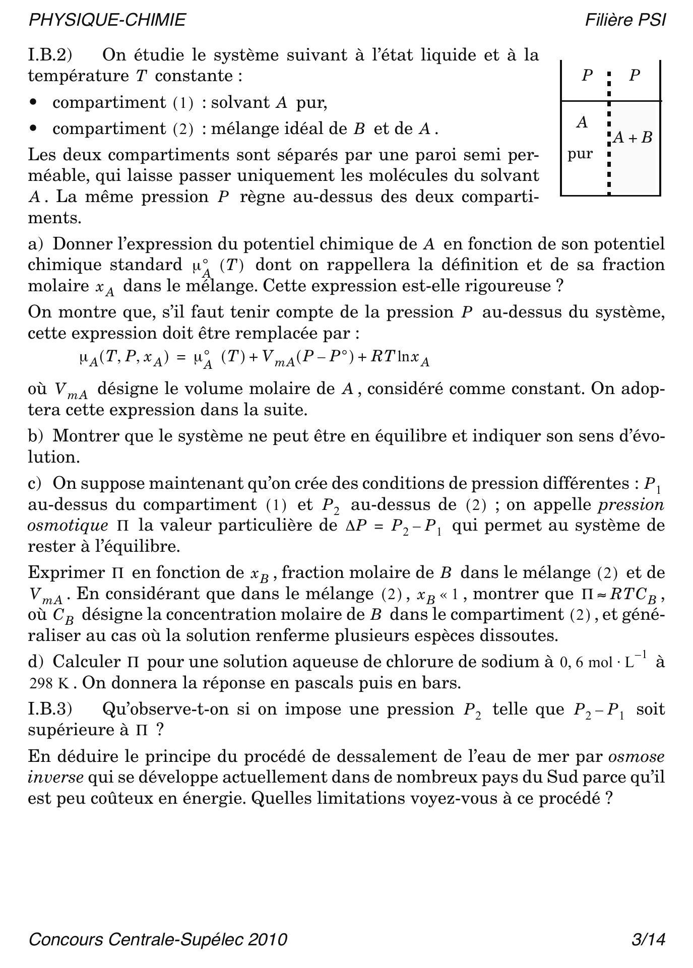 c) On suppose maintenant qu'on crée des conditions de pression différentes : au-dessus du compartiment (1) et au-dessus de (2) ; on appelle pression osmotique la valeur particulière de qui permet au système de rester à l'équilibre.