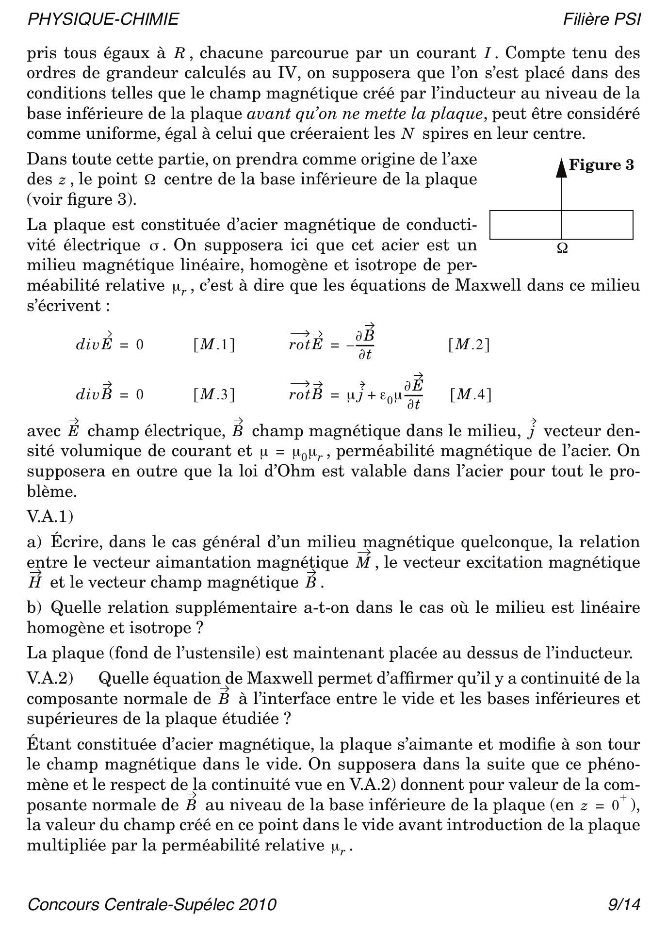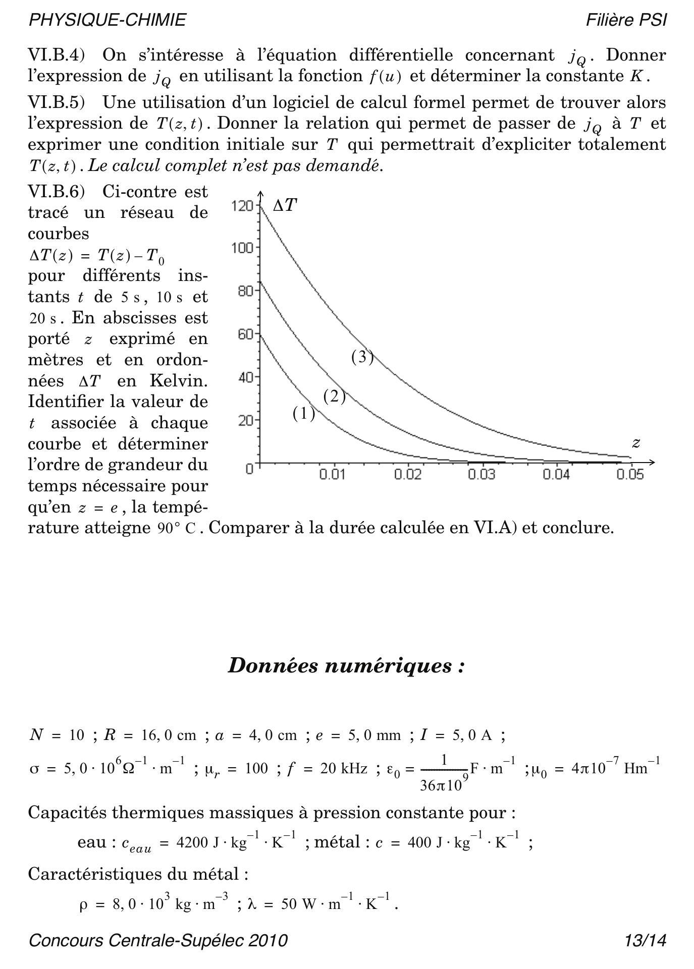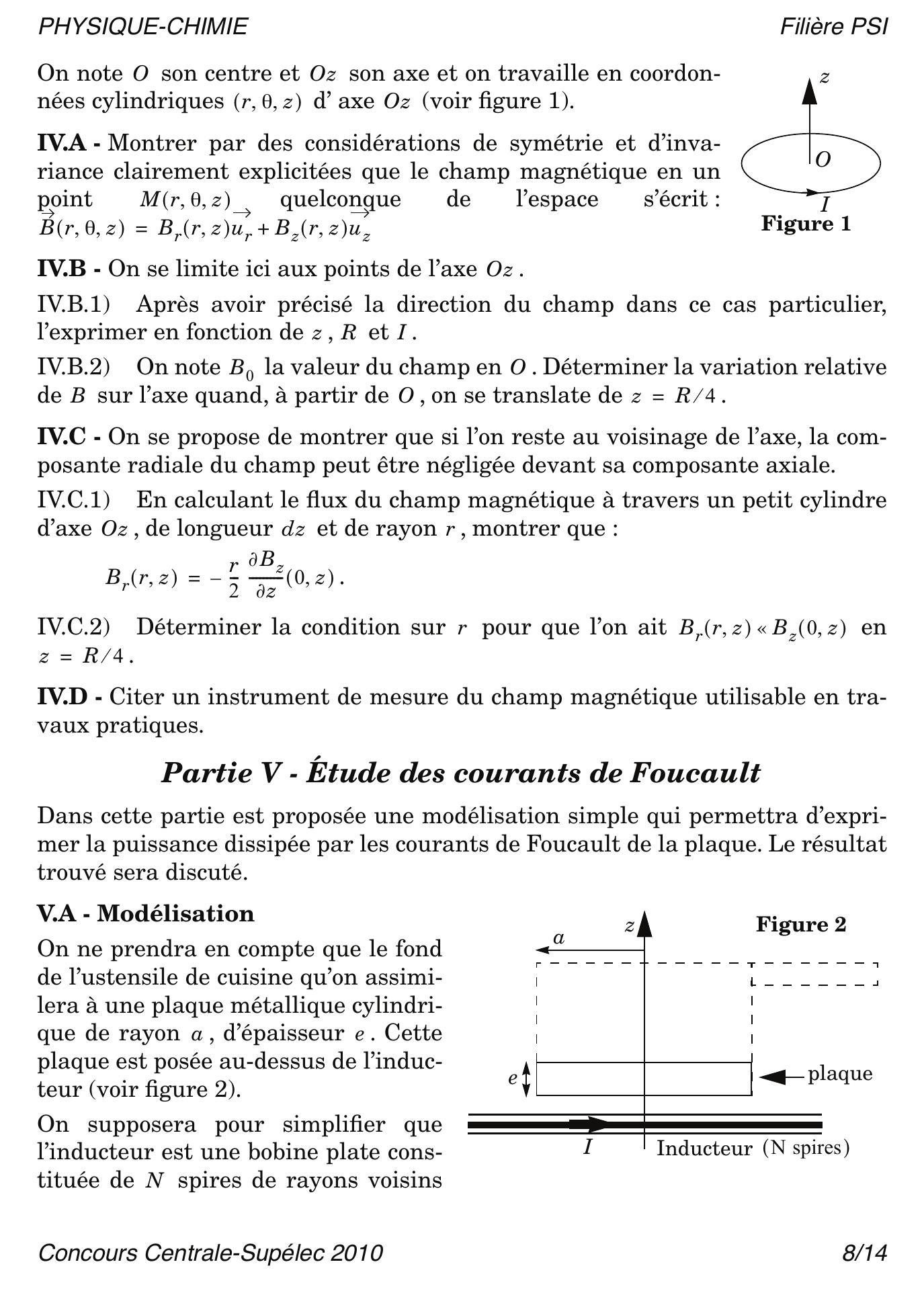 Les parties IV, V et VI sont indépendantes. Dans la Partie V, une modélisation des courants de Foucault dans le fond d'un ustensile de cuisine est proposée, après avoir étudié quelques ordres de grandeurs dans la Partie IV. Dans la Partie VI, on étudie le transfert thermique du fond de l'ustensile de cuisine aux aliments. Pour tout le problème, on se placera en coordonnées cylindriques d'axe ou .