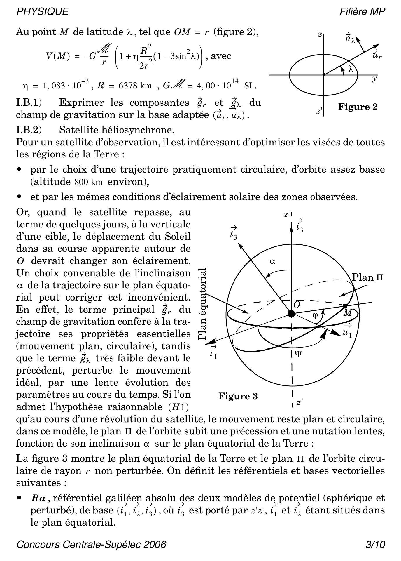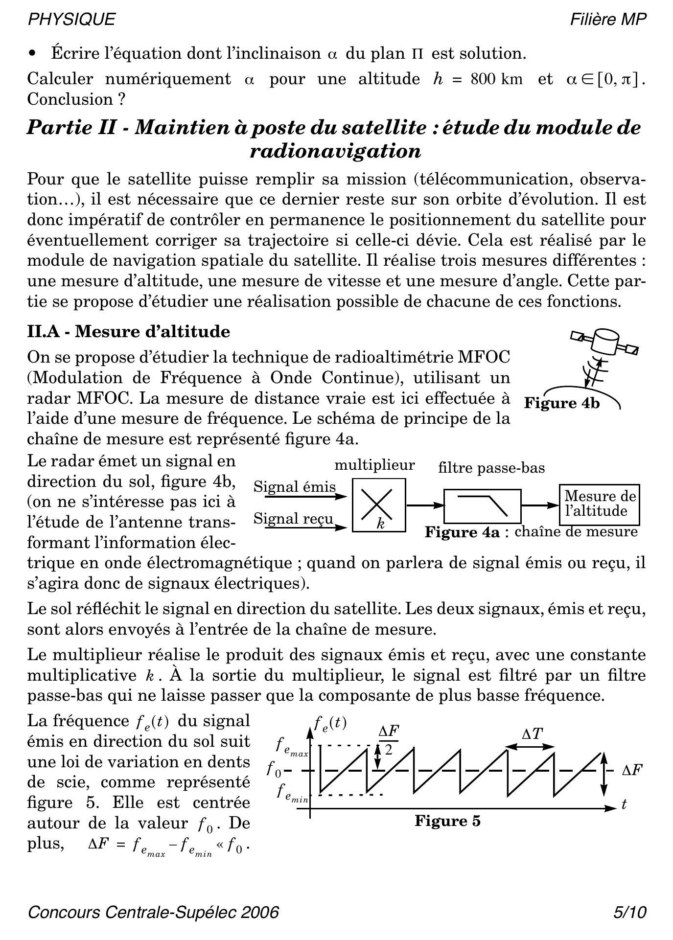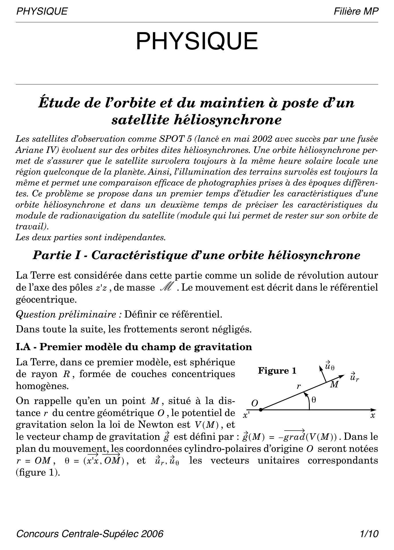 Les satellites d'observation comme SPOT 5 (lancé en mai 2002 avec succès par une fusée Ariane IV) évoluent sur des orbites dites héliosynchrones. Une orbite héliosynchrone permet de s'assurer que le satellite survolera toujours à la même heure solaire locale une région quelconque de la planète. Ainsi, l'illumination des terrains survolés est toujours la même et permet une comparaison efficace de photographies prises à des époques différentes. Ce problème se propose dans un premier temps d'étudier les caractéristiques d'une orbite héliosynchrone et dans un deuxième temps de préciser les caractéristiques du module de radionavigation du satellite (module qui lui permet de rester sur son orbite de travail).