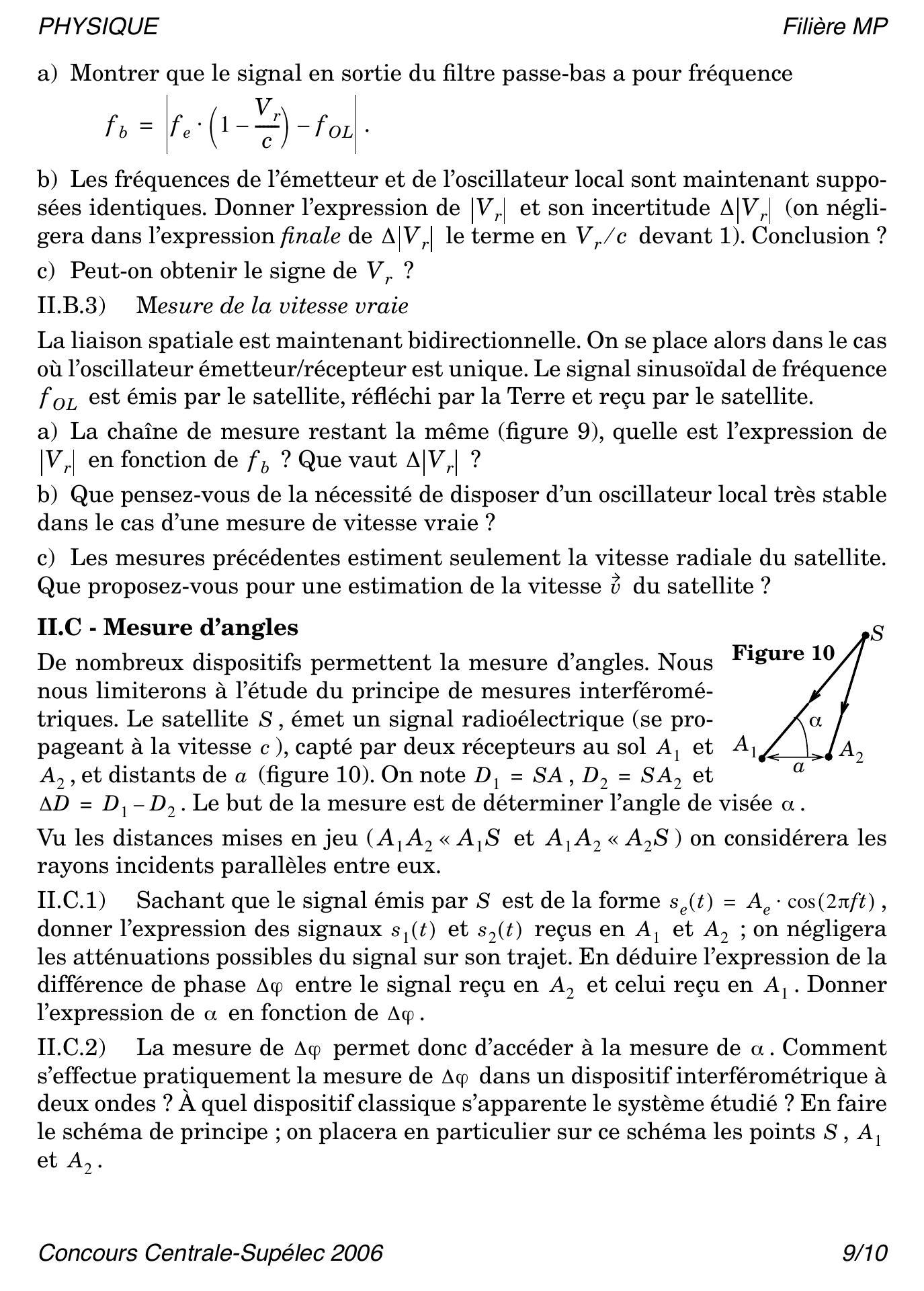 De nombreux dispositifs permettent la mesure d'angles. Nous nous limiterons à l'étude du principe de mesures interférométriques. Le satellite , émet un signal radioélectrique (se propageant à la vitesse ), capté par deux récepteurs au sol et , et distants de (figure 10). On note et . Le but de la mesure est de déterminer l'angle de visée .