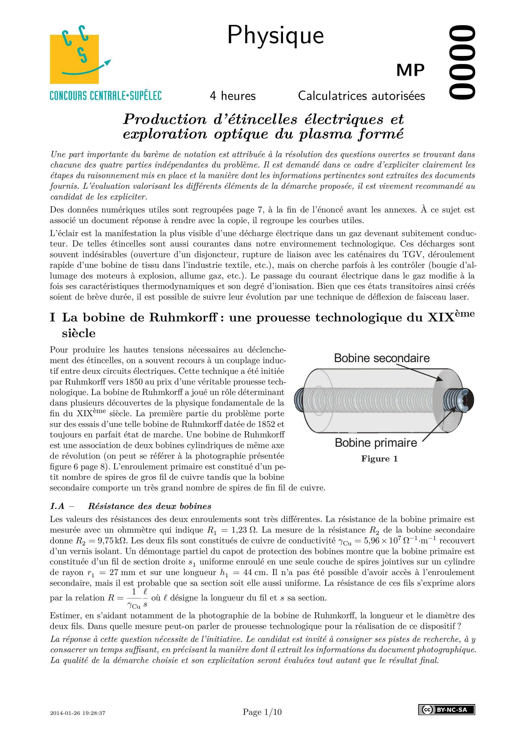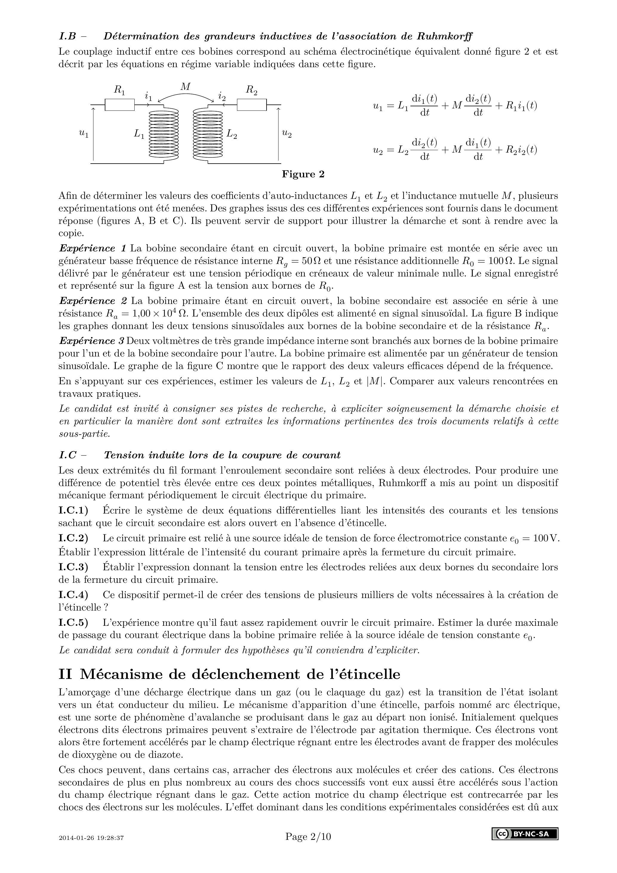 Pour produire les hautes tensions nécessaires au déclenchement des étincelles, on a souvent recours à un couplage inductif entre deux circuits électriques. Cette technique a été initiée par Ruhmkorff vers 1850 au prix d'une véritable prouesse technologique. La bobine de Ruhmkorff a joué un rôle déterminant dans plusieurs découvertes de la physique fondamentale de la fin du XIX siècle. La première partie du problème porte sur des essais d'une telle bobine de Ruhmkorff datée de 1852 et toujours en parfait état de marche. Une bobine de Ruhmkorff est une association de deux bobines cylindriques de même axe de révolution (on peut se référer à la photographie présentée figure 6 page 8). L'enroulement primaire est constitué d'un pe-