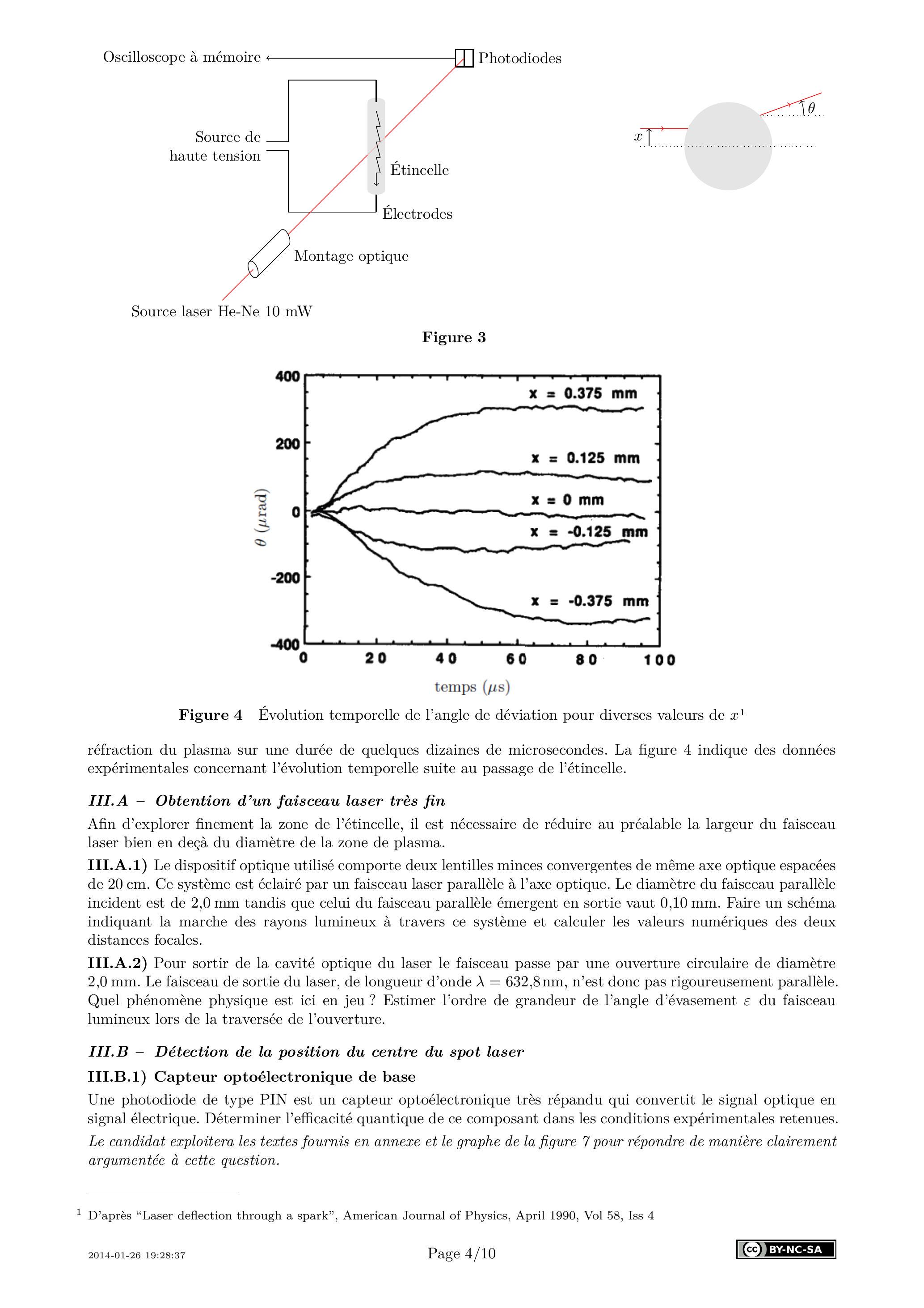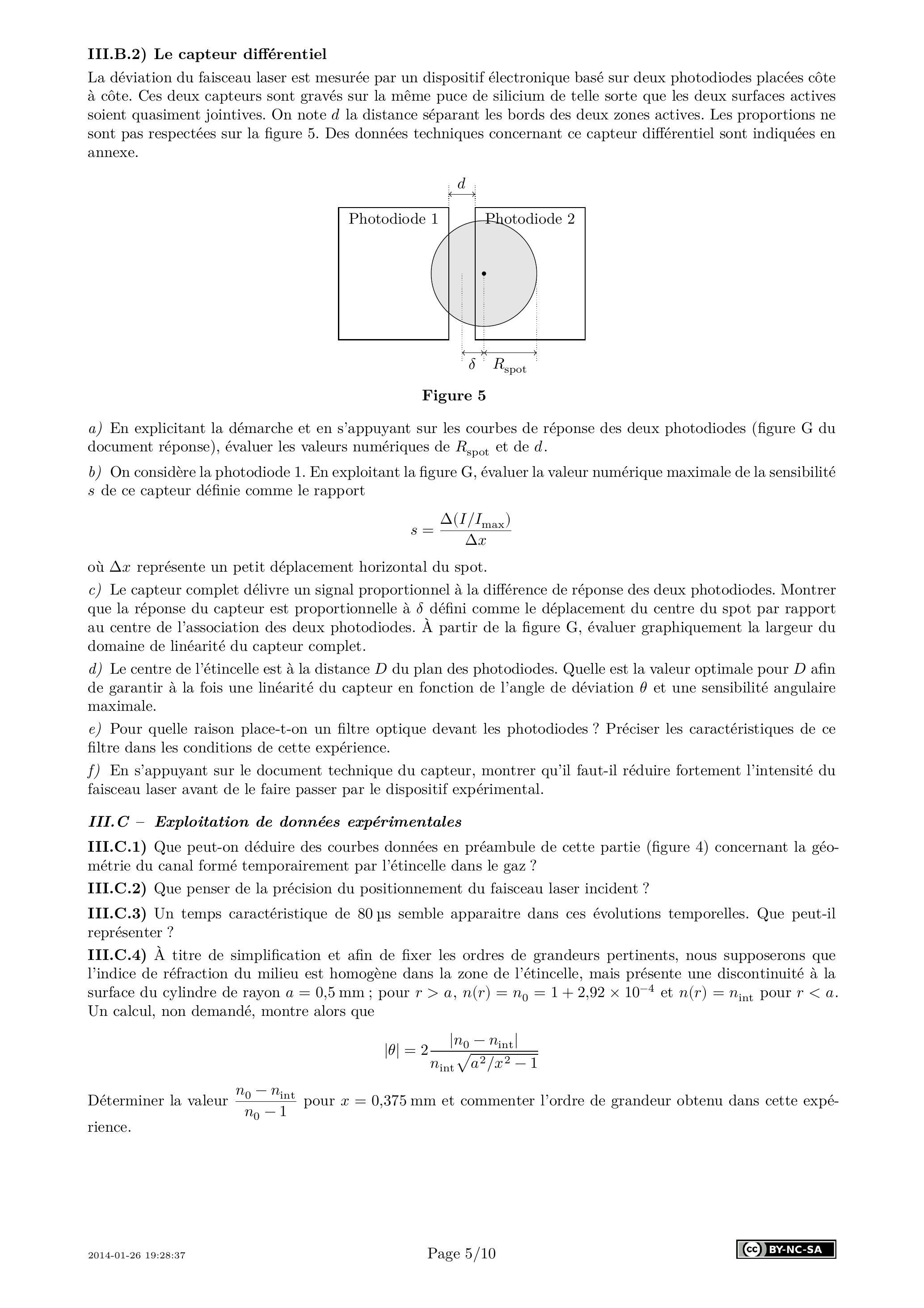 Une part importante du barème de notation est attribuée à la résolution des questions ouvertes se trouvant dans chacune des quatre parties indépendantes du problème. Il est demandé dans ce cadre d'expliciter clairement les étapes du raisonnement mis en place et la manière dont les informations pertinentes sont extraites des documents fournis. L'évaluation valorisant les différents éléments de la démarche proposée, il est vivement recommandé au candidat de les expliciter. Des données numériques utiles sont regroupées page 7, à la fin de l'énoncé avant les annexes. À ce sujet est associé un document réponse à rendre avec la copie, il regroupe les courbes utiles. L'éclair est la manifestation la plus visible d'une décharge électrique dans un gaz devenant subitement conducteur. De telles étincelles sont aussi courantes dans notre environnement technologique. Ces décharges sont souvent indésirables (ouverture d'un disjoncteur, rupture de liaison avec les caténaires du TGV, déroulement rapide d'une bobine de tissu dans l'industrie textile, etc.), mais on cherche parfois à les contrôler (bougie d'allumage des moteurs à explosion, allume gaz, etc.). Le passage du courant électrique dans le gaz modifie à la fois ses caractéristiques thermodynamiques et son degré d'ionisation. Bien que ces états transitoires ainsi créés soient de brève durée, il est possible de suivre leur évolution par une technique de déflexion de faisceau laser.