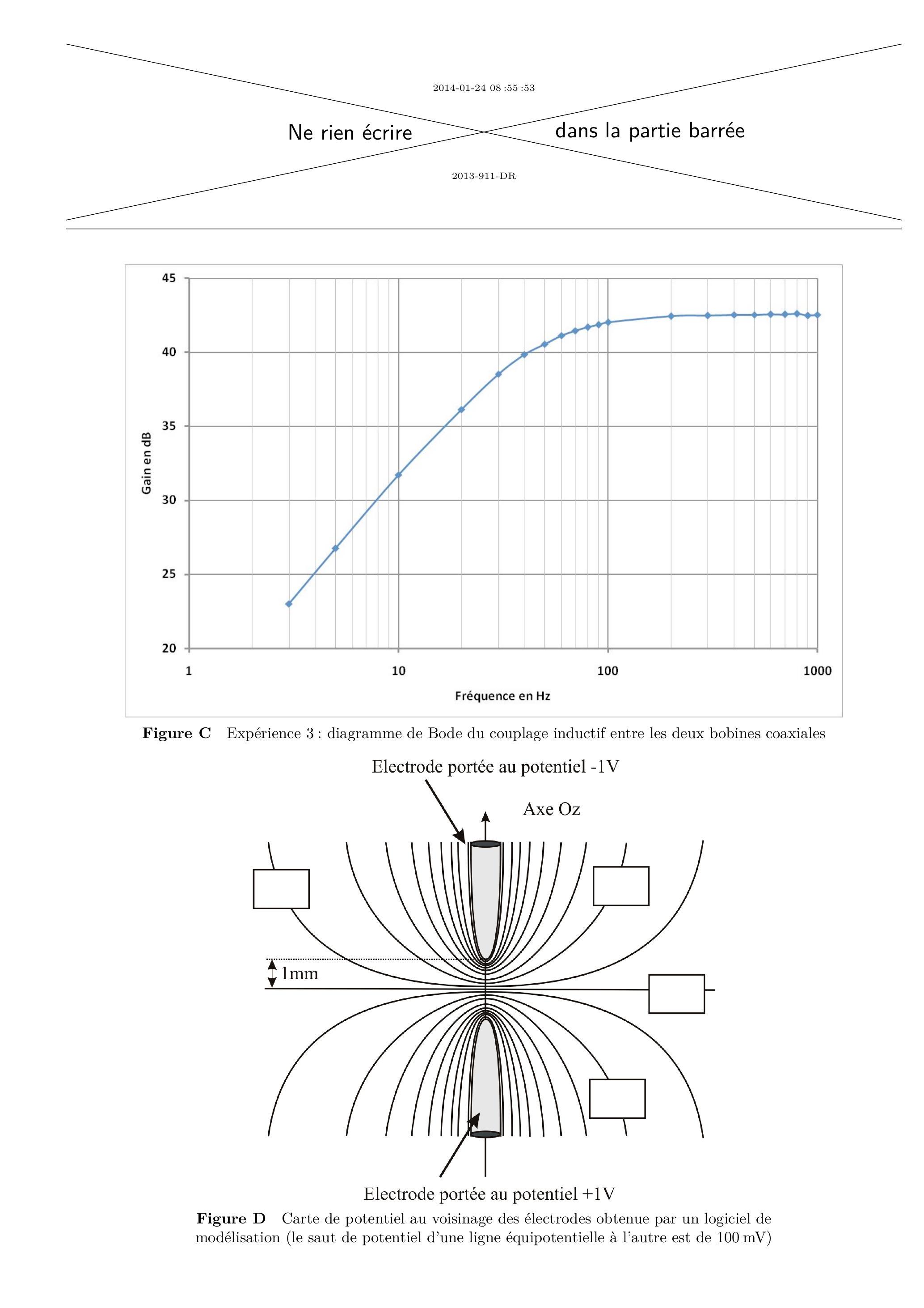 II.B.2) Compléter la carte de potentiel de la figure D par un réseau de lignes de champs électriques. Préciser le sens du champ électrique, les signes des charges électriques déposées sur chaque électrode ainsi que les valeurs des potentiels des diverses équipotentielles tracées par le logiciel de simulation dans les cadres prévus à cet effet.