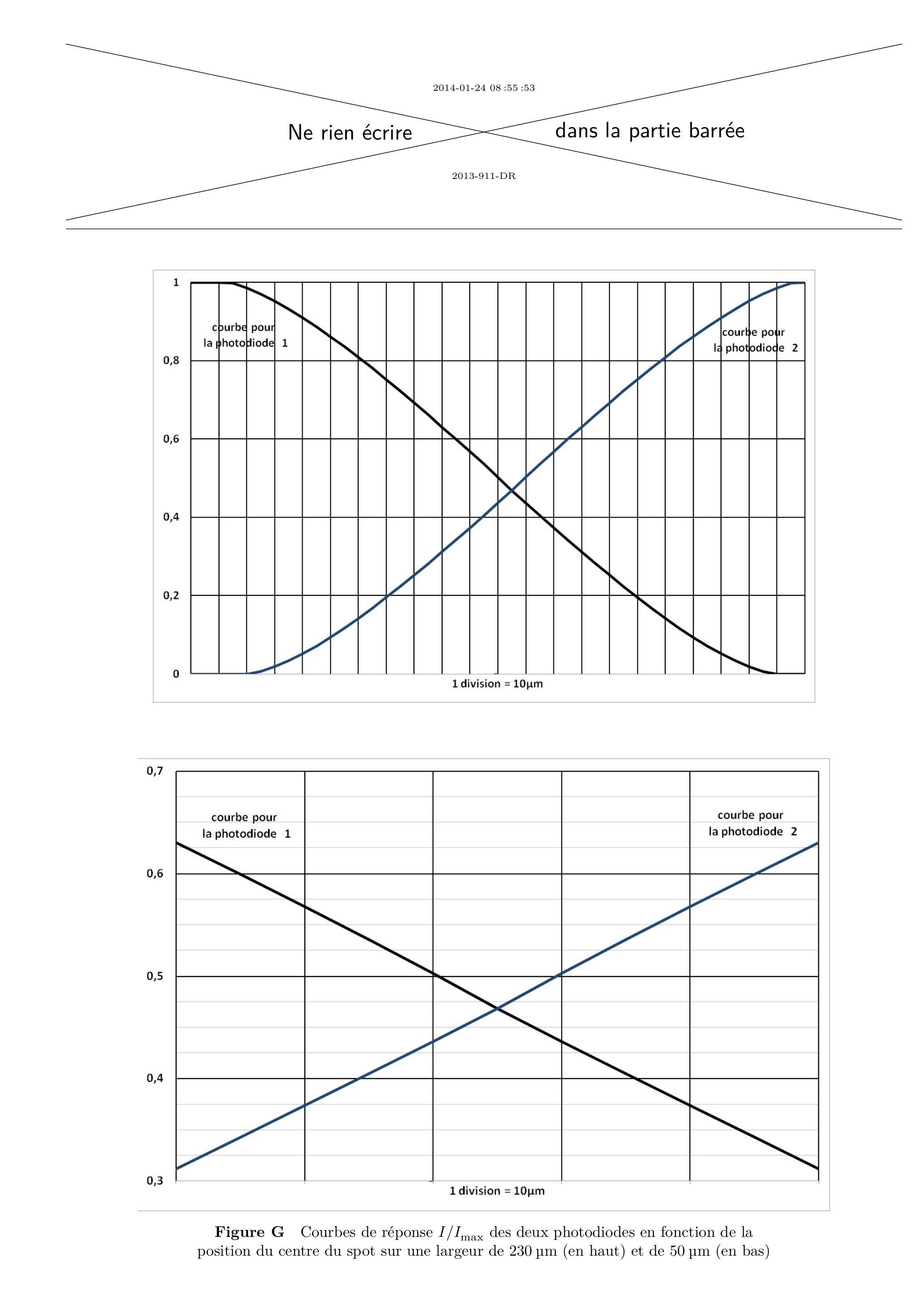 c) Le capteur complet délivre un signal proportionnel à la différence de réponse des deux photodiodes. Montrer que la réponse du capteur est proportionnelle à défini comme le déplacement du centre du spot par rapport au centre de l'association des deux photodiodes. À partir de la figure G, évaluer graphiquement la largeur du domaine de linéarité du capteur complet.