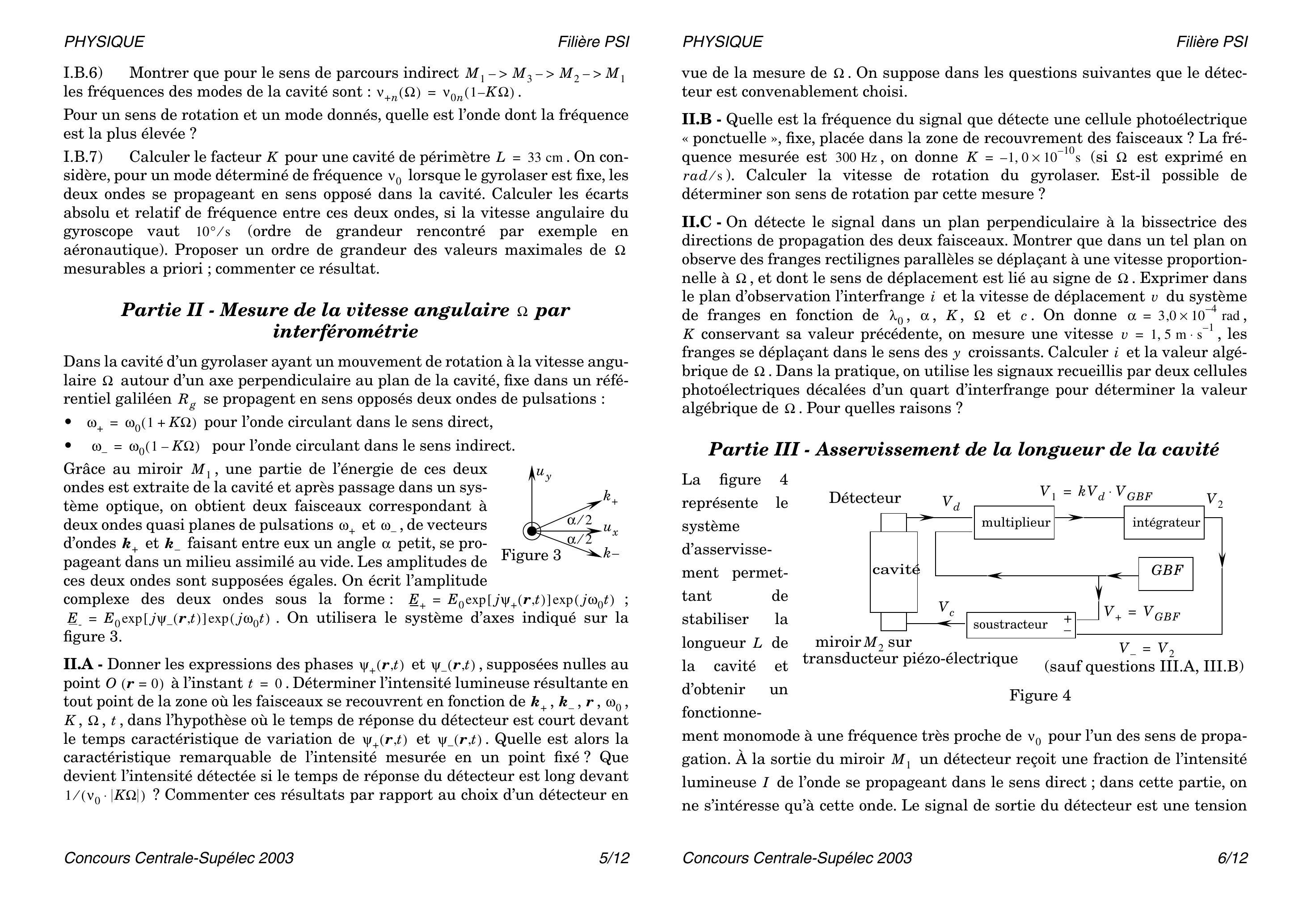 ment monomode à une fréquence très proche de pour l'un des sens de propagation. À la sortie du miroir un détecteur reçoit une fraction de l'intensité lumineuse de l'onde se propageant dans le sens direct ; dans cette partie, on ne s'intéresse qu'à cette onde. Le signal de sortie du détecteur est une tension proportionnelle à . On admet que est liée à la longueur de la cavité par une loi de la forme: où et sont des constantes positives. représente la longueur de la cavité pour laquelle la fréquence du mode est ; l'intensité est alors maximale.