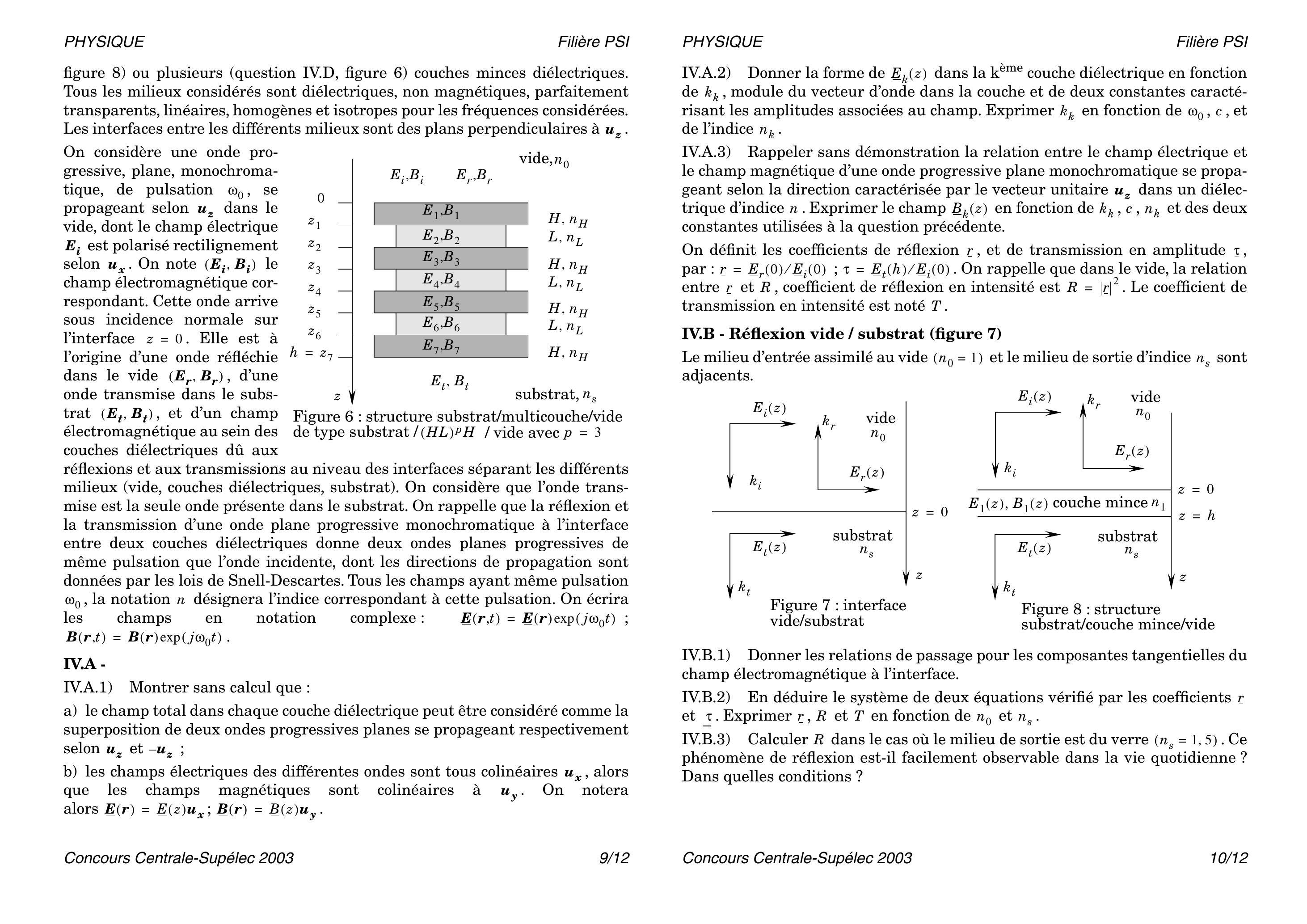 figure 8) ou plusieurs (question IV.D, figure 6) couches minces diélectriques. Tous les milieux considérés sont diélectriques, non magnétiques, parfaitement transparents, linéaires, homogènes et isotropes pour les fréquences considérées. Les interfaces entre les différents milieux sont des plans perpendiculaires à . On considère une onde progressive, plane, monochromatique, de pulsation , se propageant selon dans le vide, dont le champ électrique est polarisé rectilignement selon . On note ( ) le champ électromagnétique correspondant. Cette onde arrive sous incidence normale sur l'interface . Elle est à l'origine d'une onde réfléchie dans le vide ( ), d'une onde transmise dans le substrat ( ), et d'un champ électromagnétique au sein des couches diélectriques dû aux réflexions et aux transmissions au niveau des interfaces séparant les différents milieux (vide, couches diélectriques, substrat). On considère que l'onde transmise est la seule onde présente dans le substrat. On rappelle que la réflexion et la transmission d'une onde plane progressive monochromatique à l'interface entre deux couches diélectriques donne deux ondes planes progressives de même pulsation que l'onde incidente, dont les directions de propagation sont données par les lois de Snell-Descartes. Tous les champs ayant même pulsation , la notation désignera l'indice correspondant à cette pulsation. On écrira les champs en notation complexe: ; .