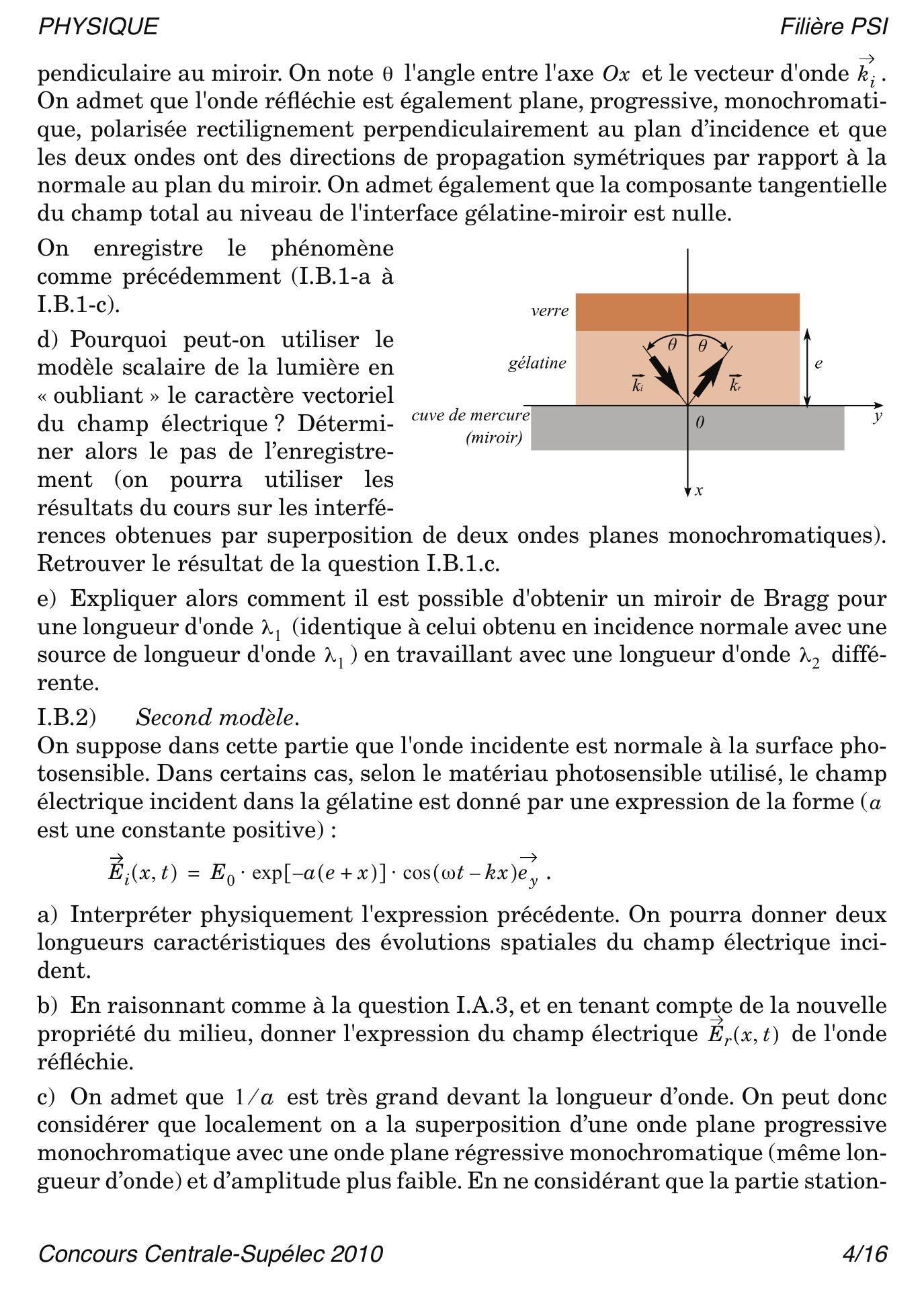 pendiculaire au miroir. On note l'angle entre l'axe et le vecteur d'onde . On admet que l'onde réfléchie est également plane, progressive, monochromatique, polarisée rectilignement perpendiculairement au plan d'incidence et que les deux ondes ont des directions de propagation symétriques par rapport à la normale au plan du miroir. On admet également que la composante tangentielle du champ total au niveau de l'interface gélatine-miroir est nulle.