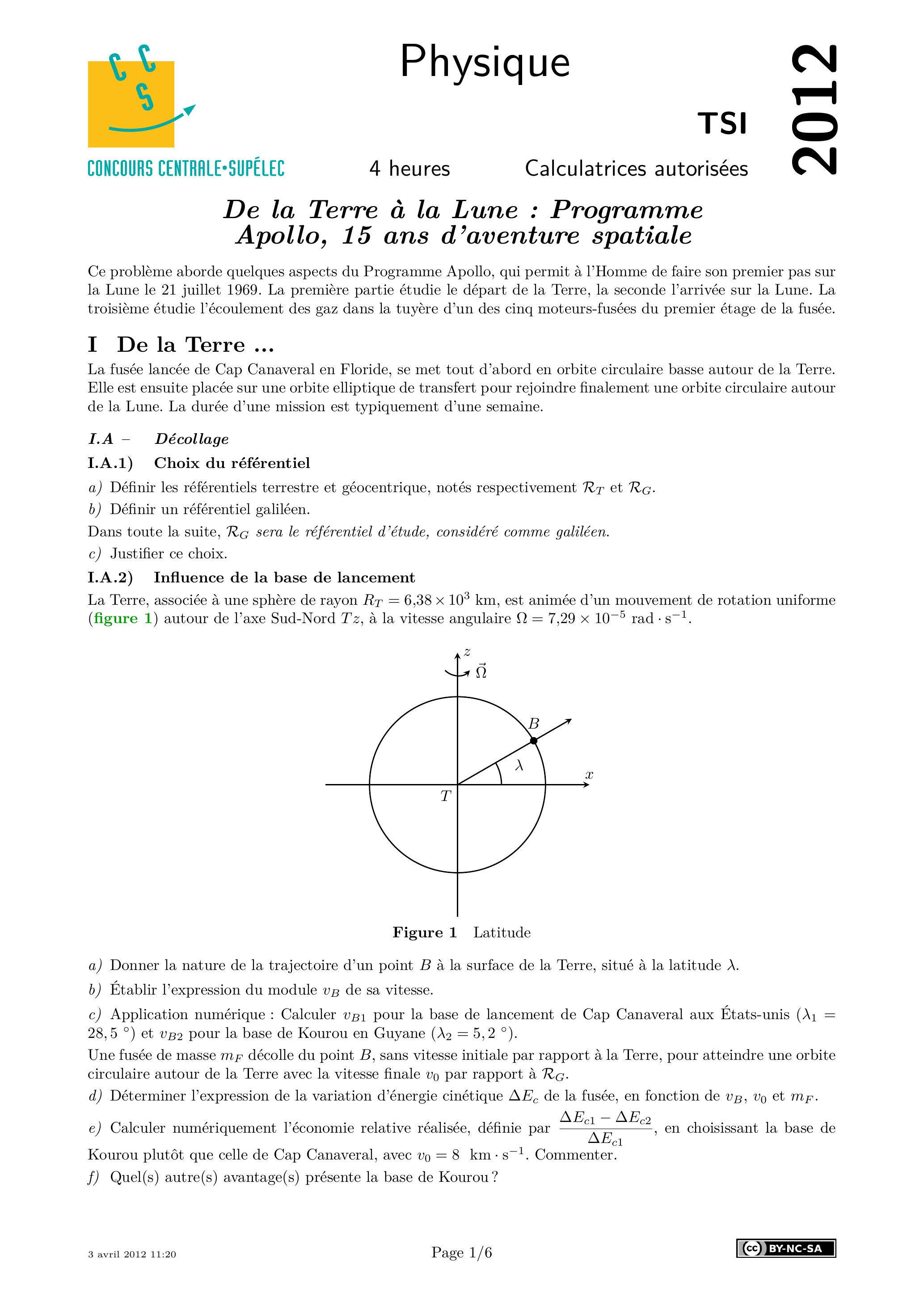 Ce problème aborde quelques aspects du Programme Apollo, qui permit à l'Homme de faire son premier pas sur la Lune le 21 juillet 1969. La première partie étudie le départ de la Terre, la seconde l'arrivée sur la Lune. La troisième étudie l'écoulement des gaz dans la tuyère d'un des cinq moteurs-fusées du premier étage de la fusée.