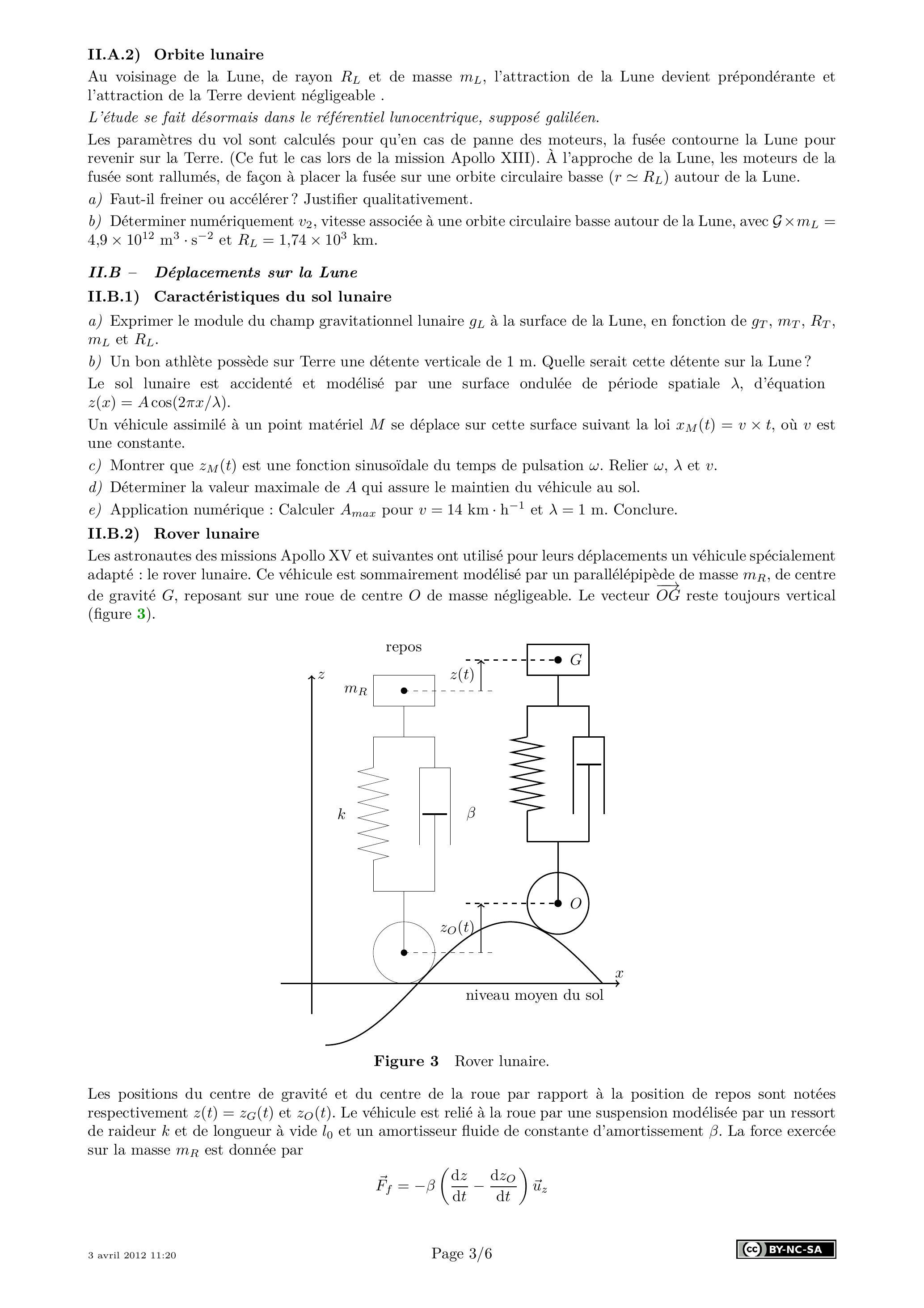 Les astronautes des missions Apollo XV et suivantes ont utilisé pour leurs déplacements un véhicule spécialement adapté : le rover lunaire. Ce véhicule est sommairement modélisé par un parallélépipède de masse , de centre de gravité , reposant sur une roue de centre de masse négligeable. Le vecteur reste toujours vertical (figure 3).