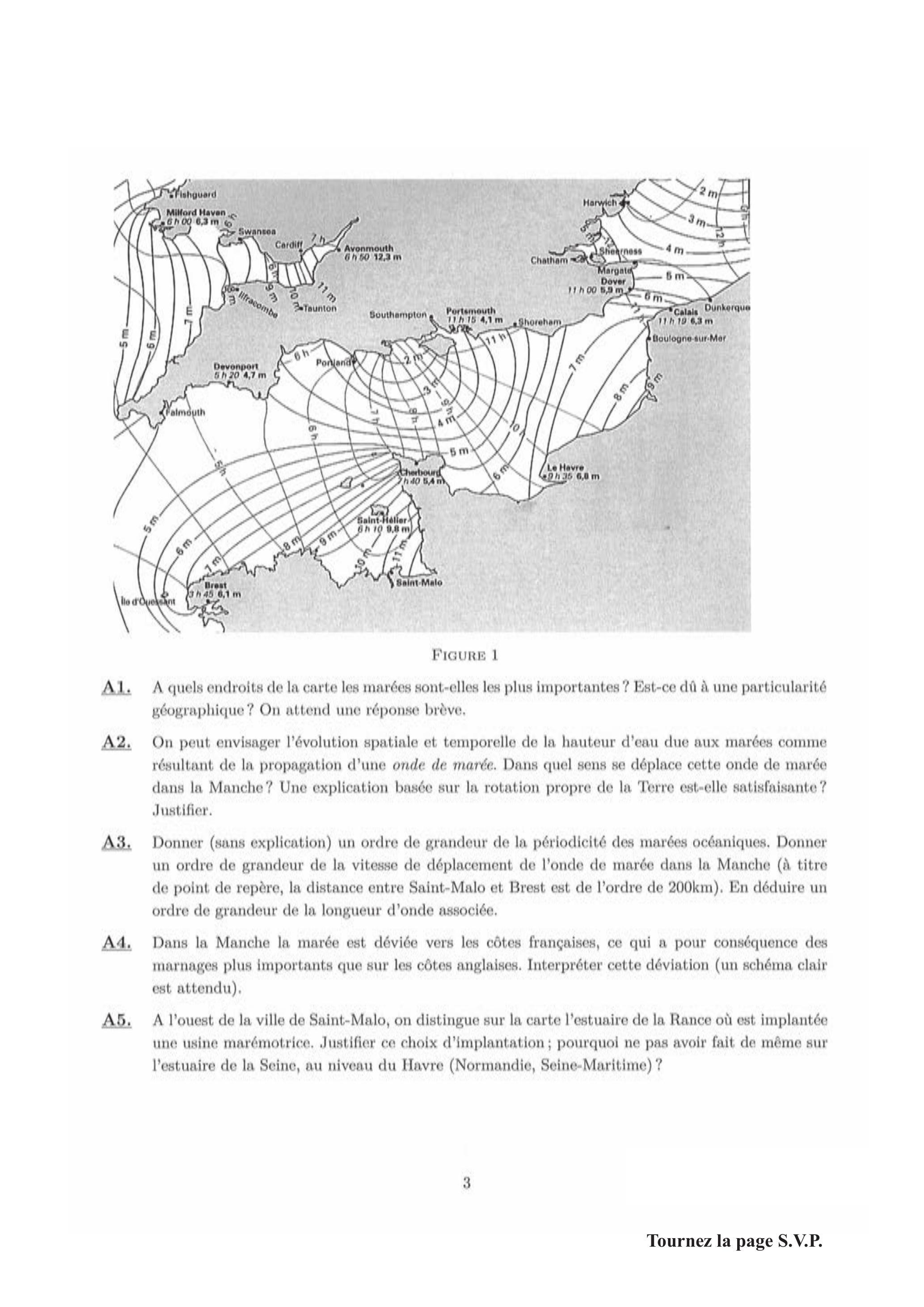 A3. Donner (sans explication) un ordre de grandeur de la périodicité des marées océaniques. Donner un ordre de grandeur de la vitesse de déplacement de l'onde de marée dans la Manche (à titre de point de repère, la distance entre Saint-Malo et Brest est de l'ordre de 200 km ). En déduire un ordre de grandeur de la longueur d'onde associée.
