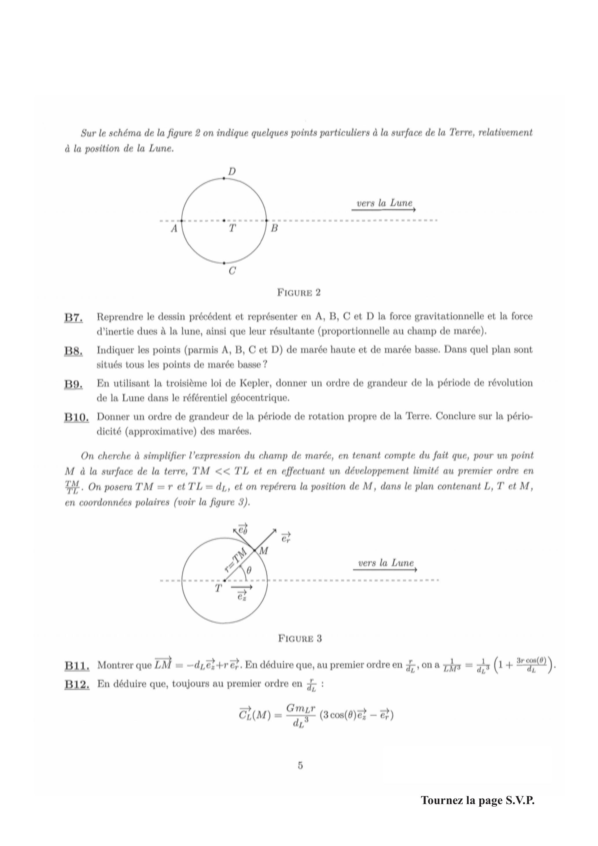 Les marées sont essentiellement dues à l'influence de la Lune, celle du Soleil se traduisant par une plus ou moins grande amplitude (marées de vives eaux et de mortes caux), Dans la suite on ne considère que l'influence de la Lune. Le résultat de la question B6 est transposable à n'importe quel astre, l'expression du champ de marée dû̀ à la Lune est donc (L désignant le centre de la Lune) :