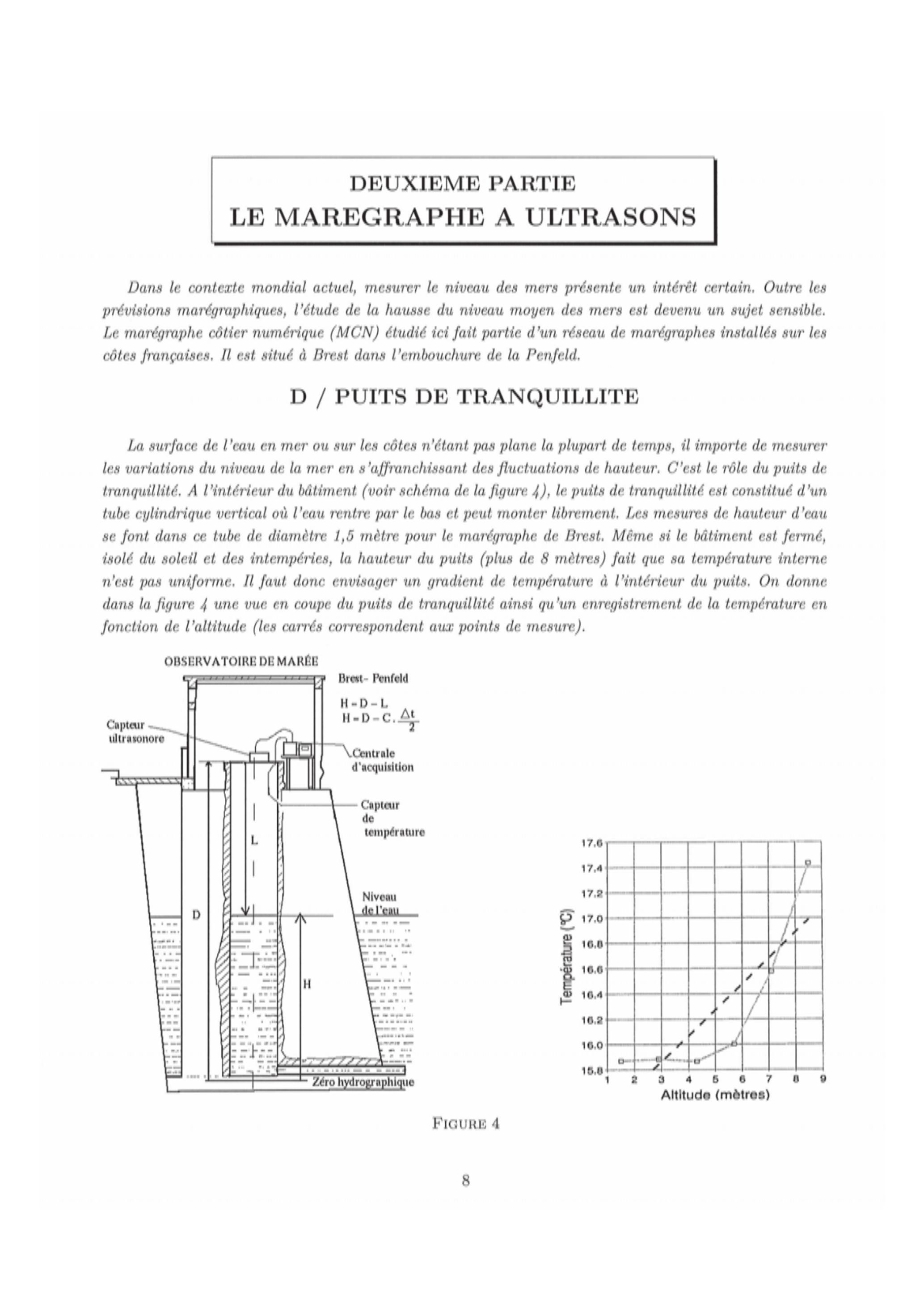 La surface de l'eau en mer ou sur les côtes n'étant pas plane la plupart de temps, il importe de mesurer les variations du niveau de la mer en s'affranchissant des fluctuations de hauteur. C'est le rôle du puits de tranquillité. A l'intérieur du bâtiment (voir schéma de la figure 4), le puits de tranquillité est constitué d'un tube cylindrique vertical où l'eau rentre par le bas et peut monter librement. Les mesures de hauteur d'eau se font dans ce tube de diamètre 1,5 mètre pour le marégraphe de Brest. Même si le bâtiment est fermé, isolé du soleil et des intempéries, la hauteur du puits (plus de 8 mètres) fait que sa température interne n'est pas uniforme. Il faut donc envisager un gradient de température à l'intérieur du puits. On donne dans la figure 4 une vue en coupe du puits de tranquillité ainsi qu'un enregistrement de la température en fonction de l'altitude (les carrés correspondent aux points de mesure).