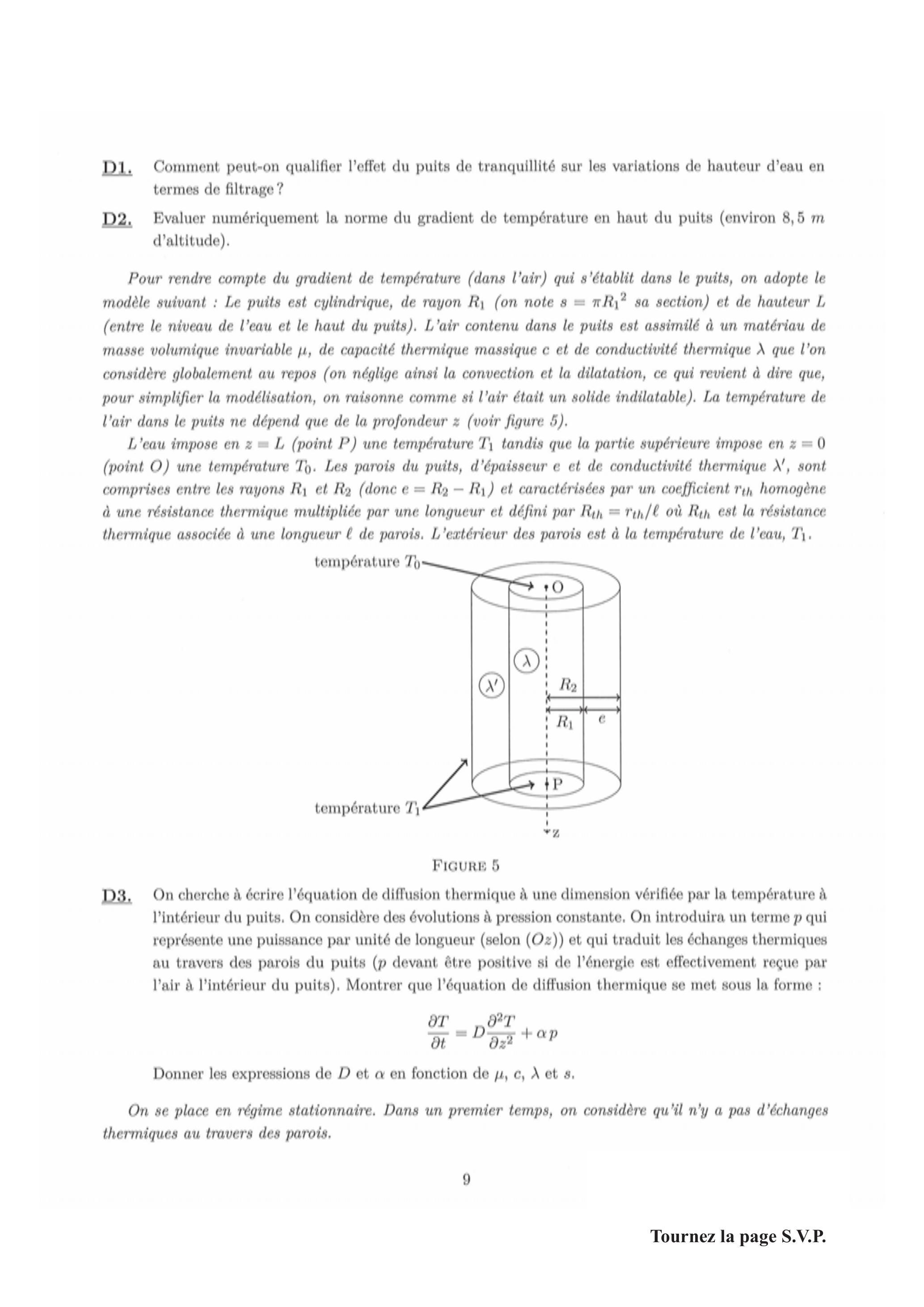 D3. On cherche à écrire l'équation de diffusion thermique à une dimension vérifiée par la température à l'intérieur du puits. On considère des évolutions à pression constante. On introduira un terme qui représente une puissance par unité de longueur (selon ) et qui traduit les échanges thermiques au travers des parois du puits ( devant être positive si de l'énergie est effectivement reçue par l'air à l'intérieur du puits). Montrer que l'équation de diffusion thermique se met sous la forme :