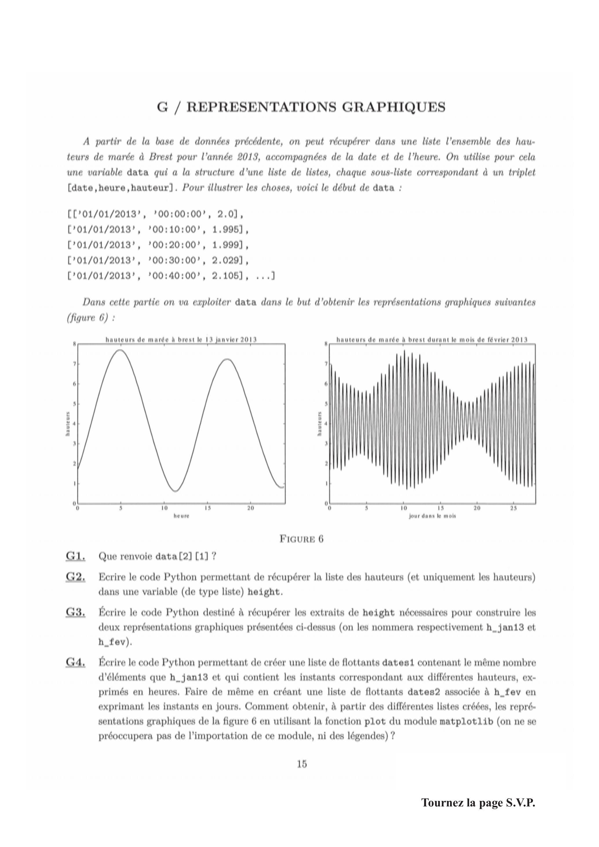 G4. Écrire le code Python permettant de créer une liste de flottants dates1 contenant le même nombre d'éléments que et qui contient les instants correspondant aux différentes hauteurs, exprimés en heures. Faire de même en créant une liste de flottants dates2 associée à en exprimant les instants en jours. Comment obtenir, à partir des différentes listes créées, les représentations graphiques de la figure 6 en utilisant la fonction plot du module matplotlib (on ne se préoccupera pas de l'importation de ce module, ni des légendes) ?