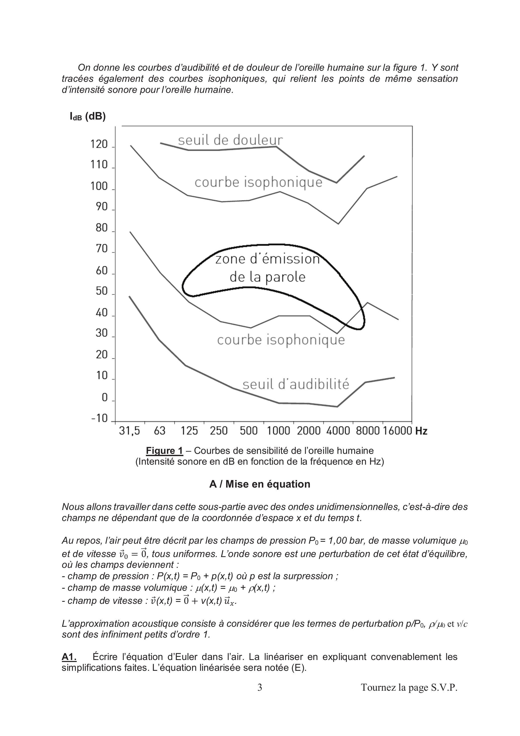 A3. Lors du passage d'une onde sonore, les transformations de l'air sont supposées adiabatiques réversibles. On introduit le coefficient de compressibilité isentropique de l'air. Rappeler l'expression de s en fonction de la pression et du volume d'une particule de fluide, puis en fonction de la pression et de la masse volumique du fluide . Linéariser cette expression dans le cadre de l'approximation acoustique. L'équation linéarisée sera notée (T).