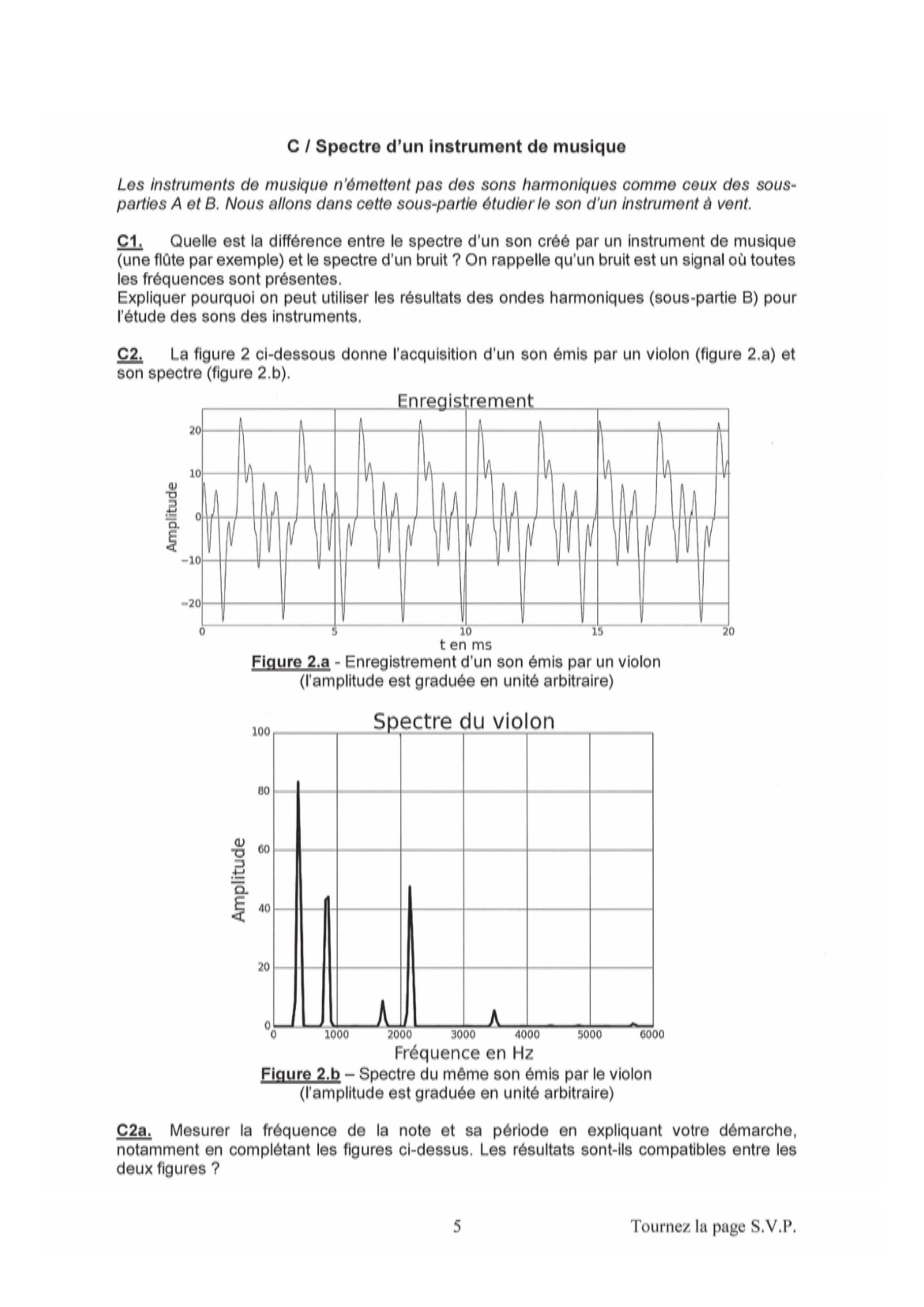 C2. La figure 2 ci-dessous donne l'acquisition d'un son émis par un violon (figure 2.a) et son spectre (figure 2.b).