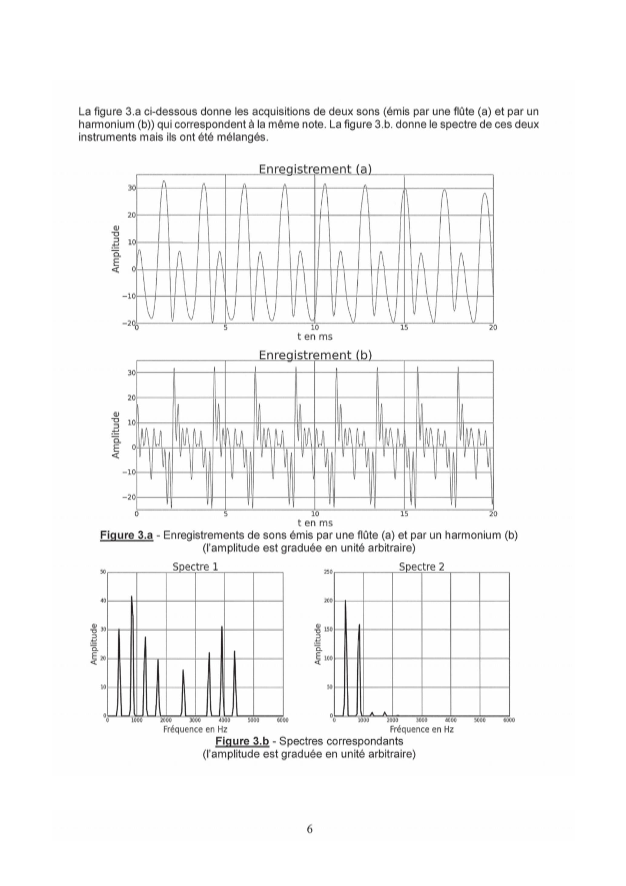 La figure 3.a ci-dessous donne les acquisitions de deux sons (émis par une flûte (a) et par un harmonium (b)) qui correspondent à la même note. La figure 3.b. donne le spectre de ces deux instruments mais ils ont été mélangés.