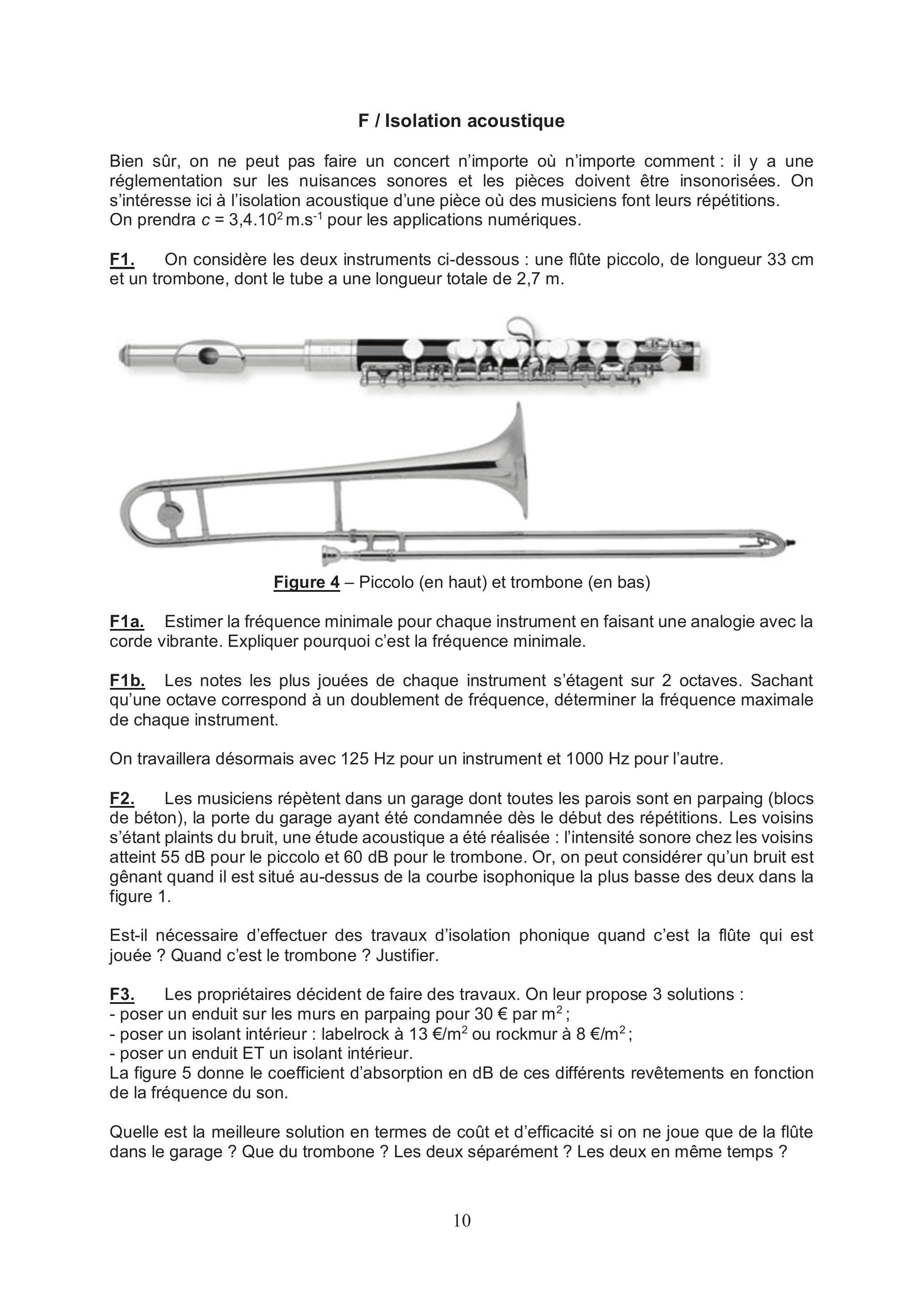 F2. Est-il nécessaire d'effectuer des travaux d'isolation phonique quand c'est la flûte qui est jouée ? quand c'est le trombone ? Justifier.