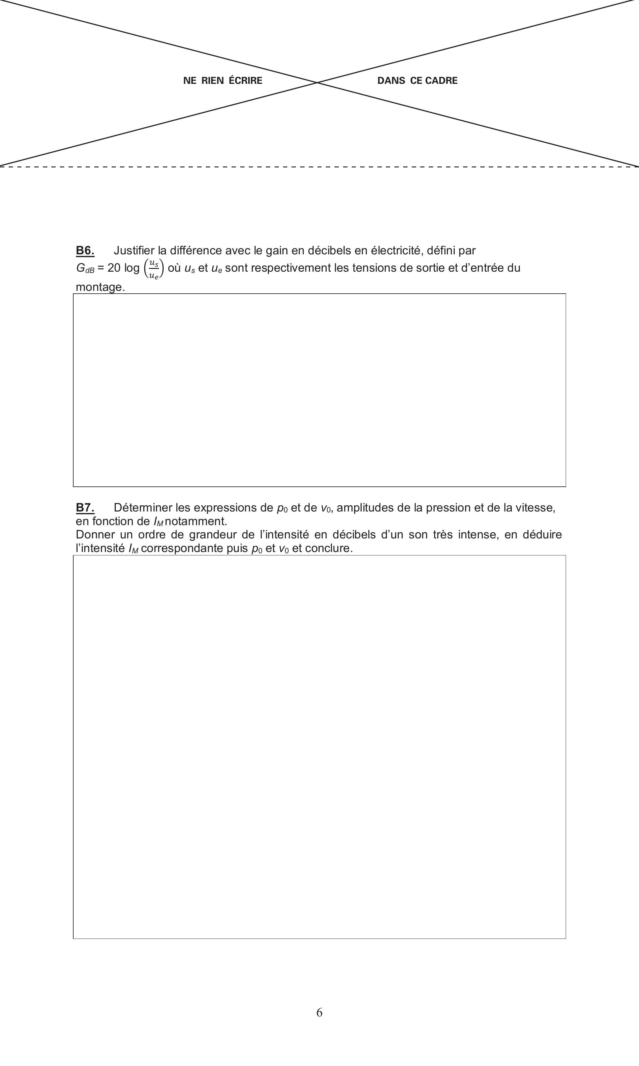 B6. Justifier la différence avec le gain en décibels en électricité, défini par où et sont respectivement les tensions de sortie et d'entrée du montage.