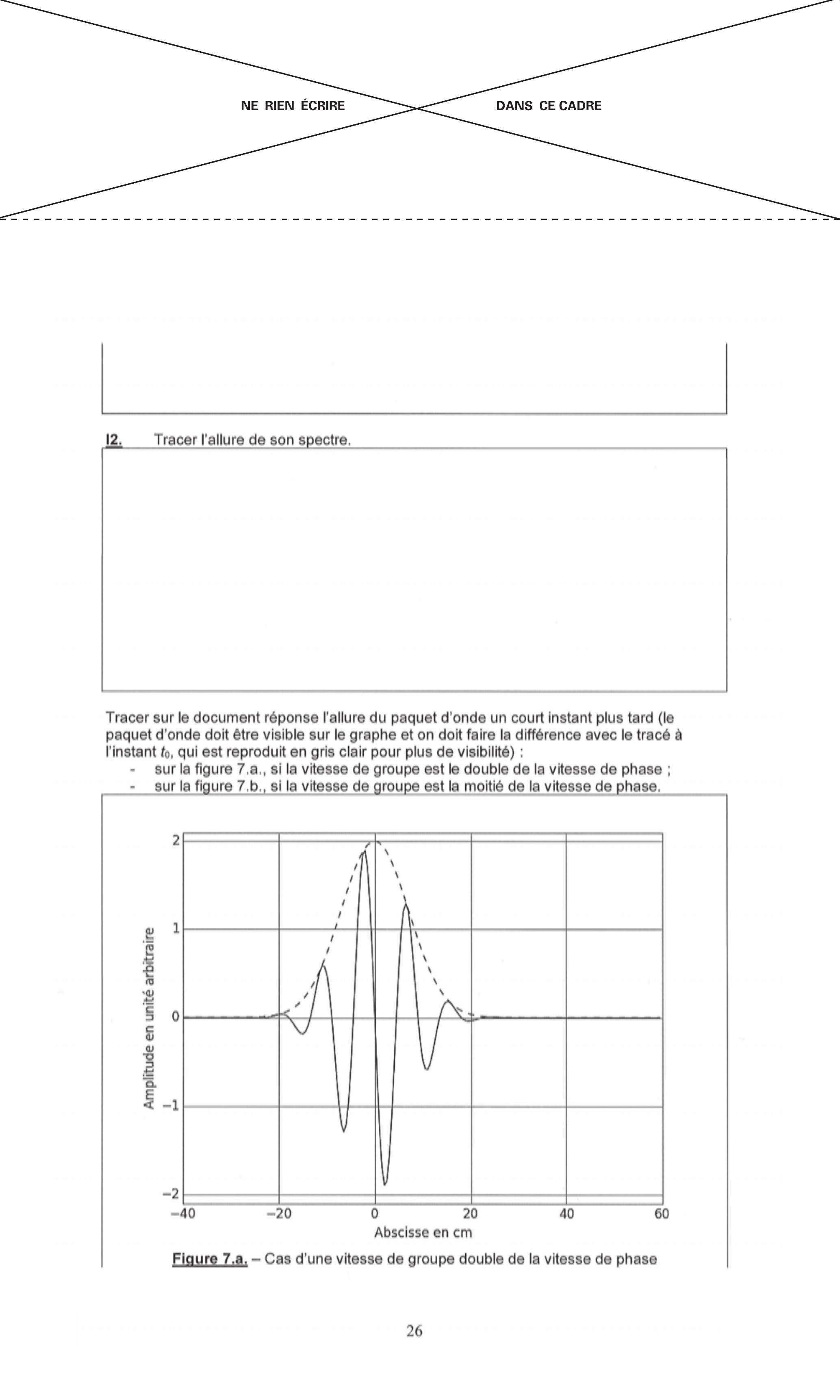 Tracer sur le document réponse l'allure du paquet d'onde un court instant plus tard (le paquet d'onde doit être visible sur le graphe et on doit faire la différence avec le tracé à l'instant , qui est reproduit en gris clair pour plus de visibilité) :