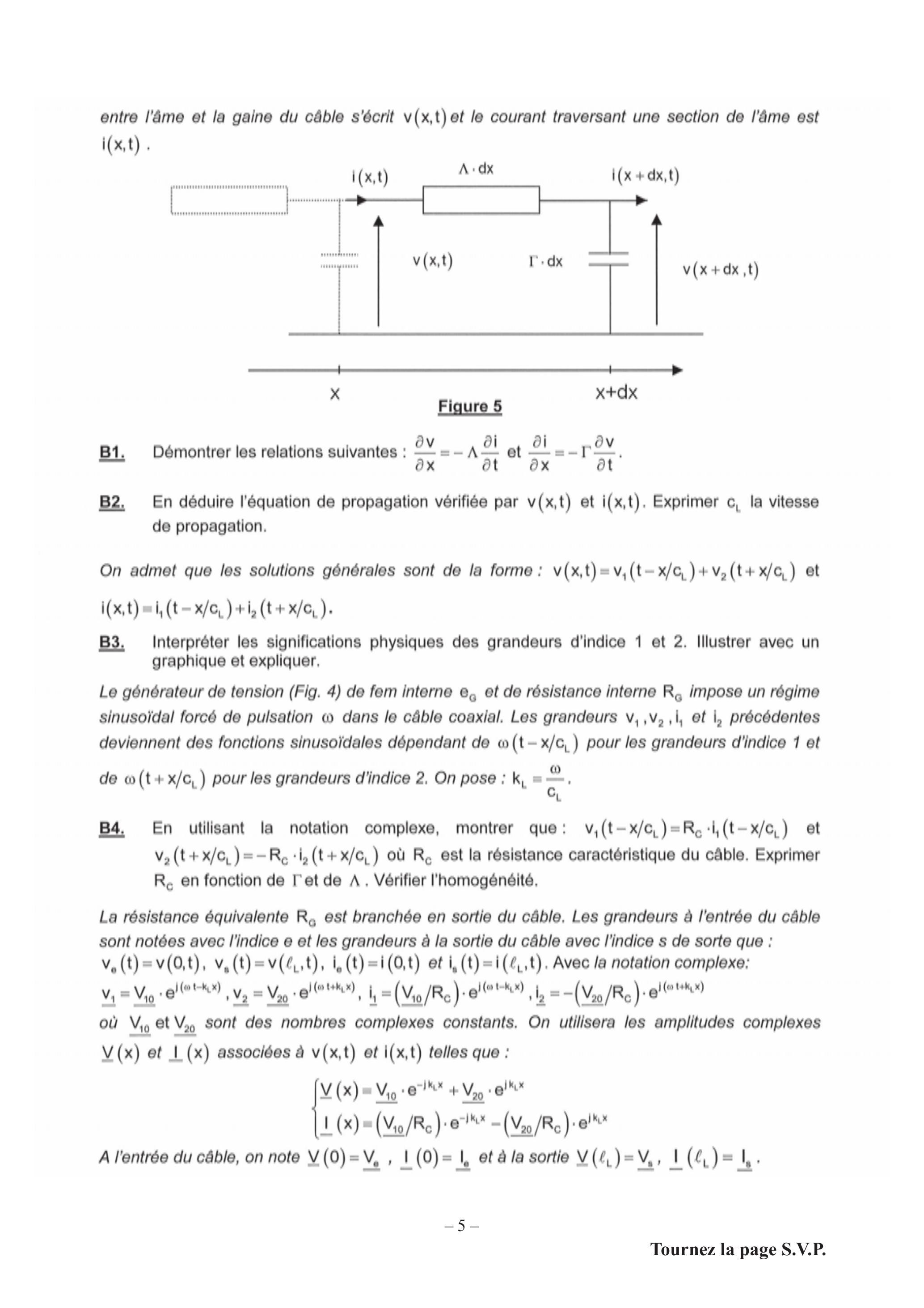 B4. En utilisant la notation complexe, montrer que: et où est la résistance caractéristique du câble. Exprimer en fonction de et de . Vérifier l'homogénéité.