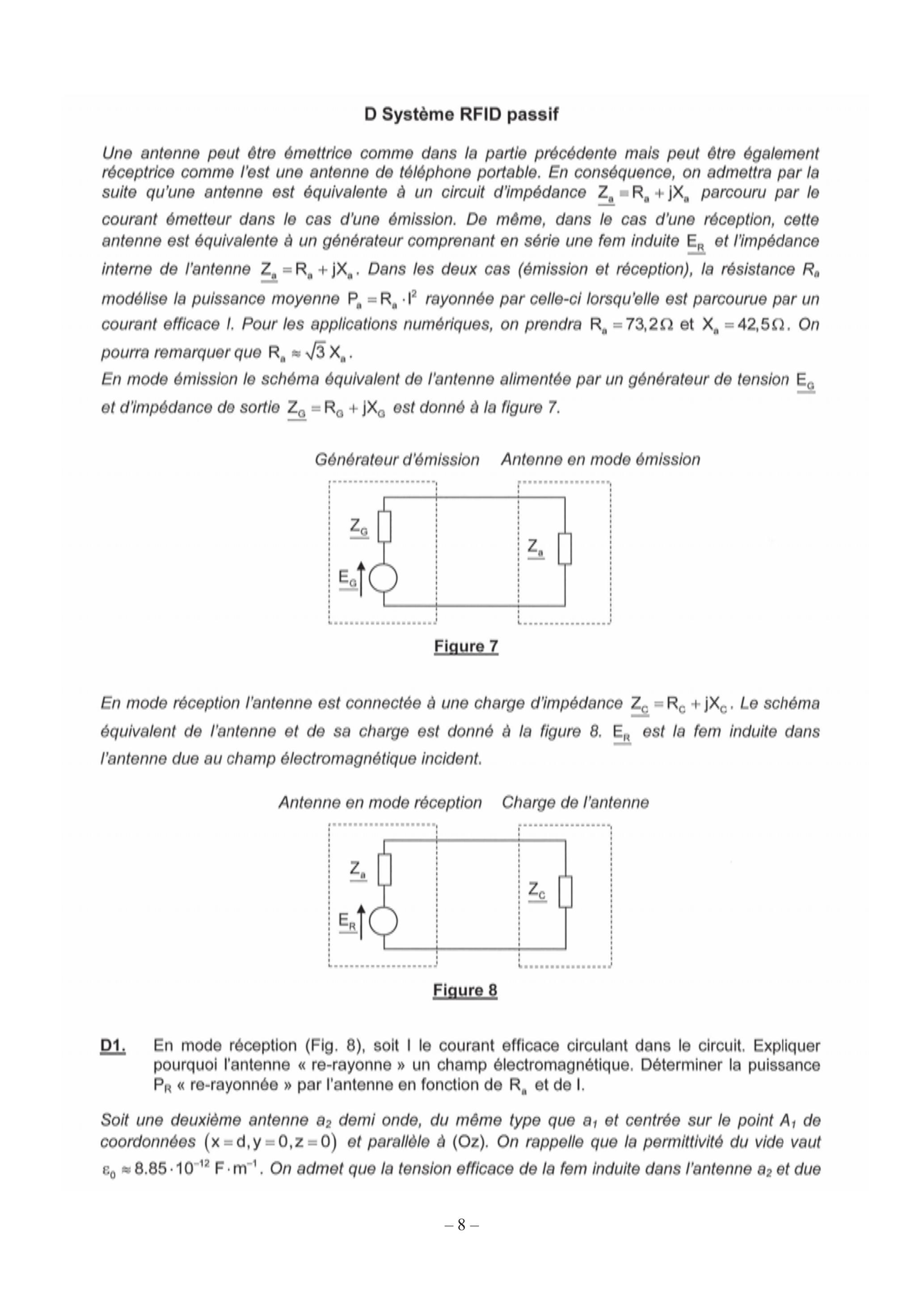 D1. En mode réception (Fig. 8), soit I le courant efficace circulant dans le circuit. Expliquer pourquoi l'antenne «re-rayonne» un champ électromagnétique. Déterminer la puissance « re-rayonnée» par l'antenne en fonction de et de .
