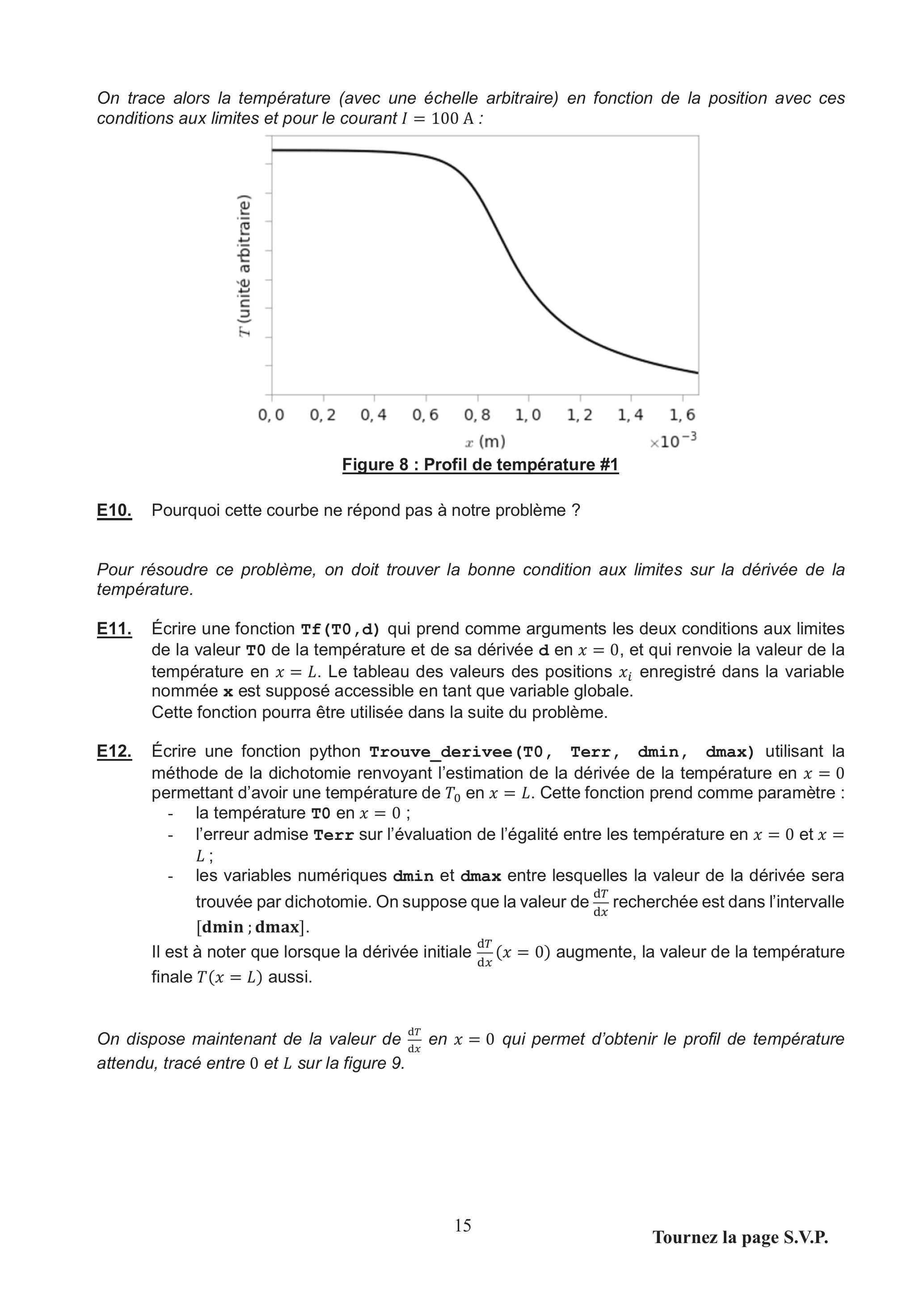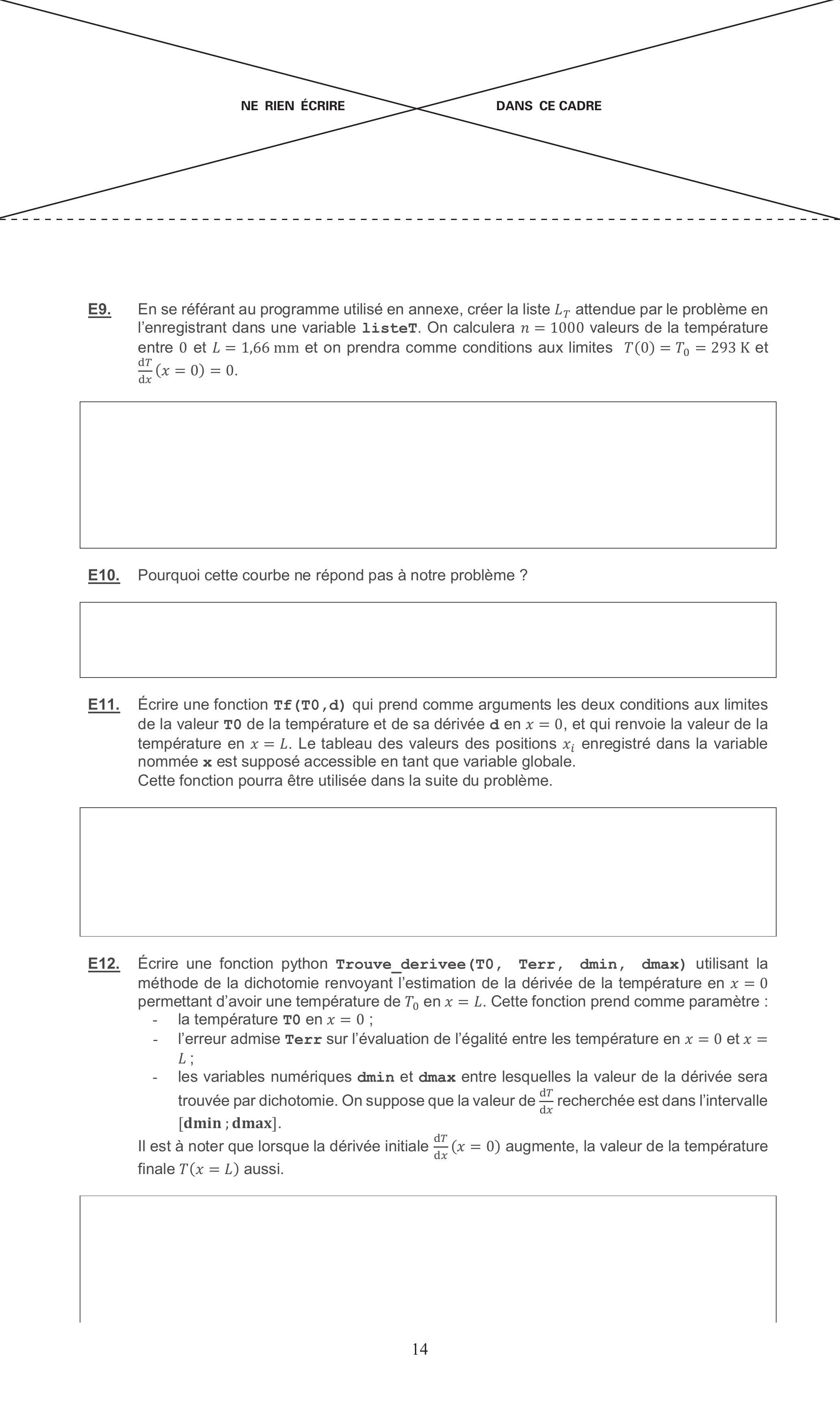 E11. Écrire une fonction qui prend comme arguments les deux conditions aux limites de la valeur T 0 de la température et de sa dérivée d en , et qui renvoie la valeur de la température en . Le tableau des valeurs des positions enregistré dans la variable nommée est supposé accessible en tant que variable globale. Cette fonction pourra être utilisée dans la suite du problème.
