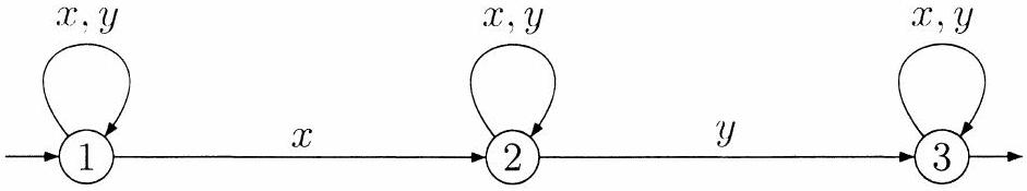 a) Dans le cas particulier oùest l'alphabet à deux lettres et , on remarquera que le langage est le langage reconnu par l'automate représenté dans la figure 1 ci-dessous. Proposer une expression rationnelle de .