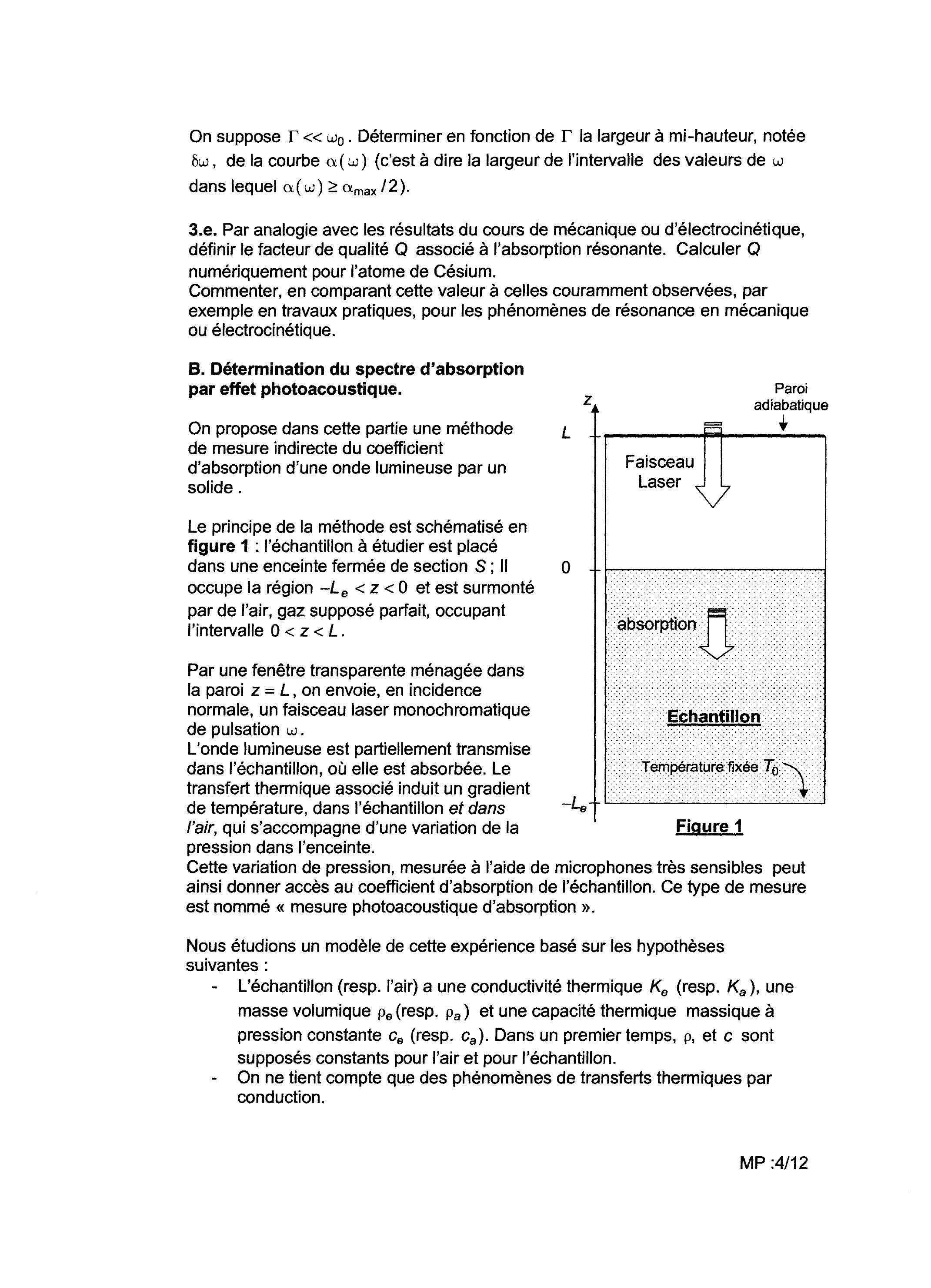 Ce problème s'intéresse à divers aspects de la spectroscopie d'absorption et à ses applications. Dans la première partie, on étudie un modèle de l'absorption résonante d'une onde électromagnétique dans un milieu. Dans la deuxième partie, on s'intéresse à la méthode de mesure photoacoustique, qui permet d'étudier l'absorption de la lumière par les effets thermiques qu'elle induit. La troisième partie propose une application de la spectroscopie d'absorption à l'étude de la cinétique d'une réaction d'isomérisation.