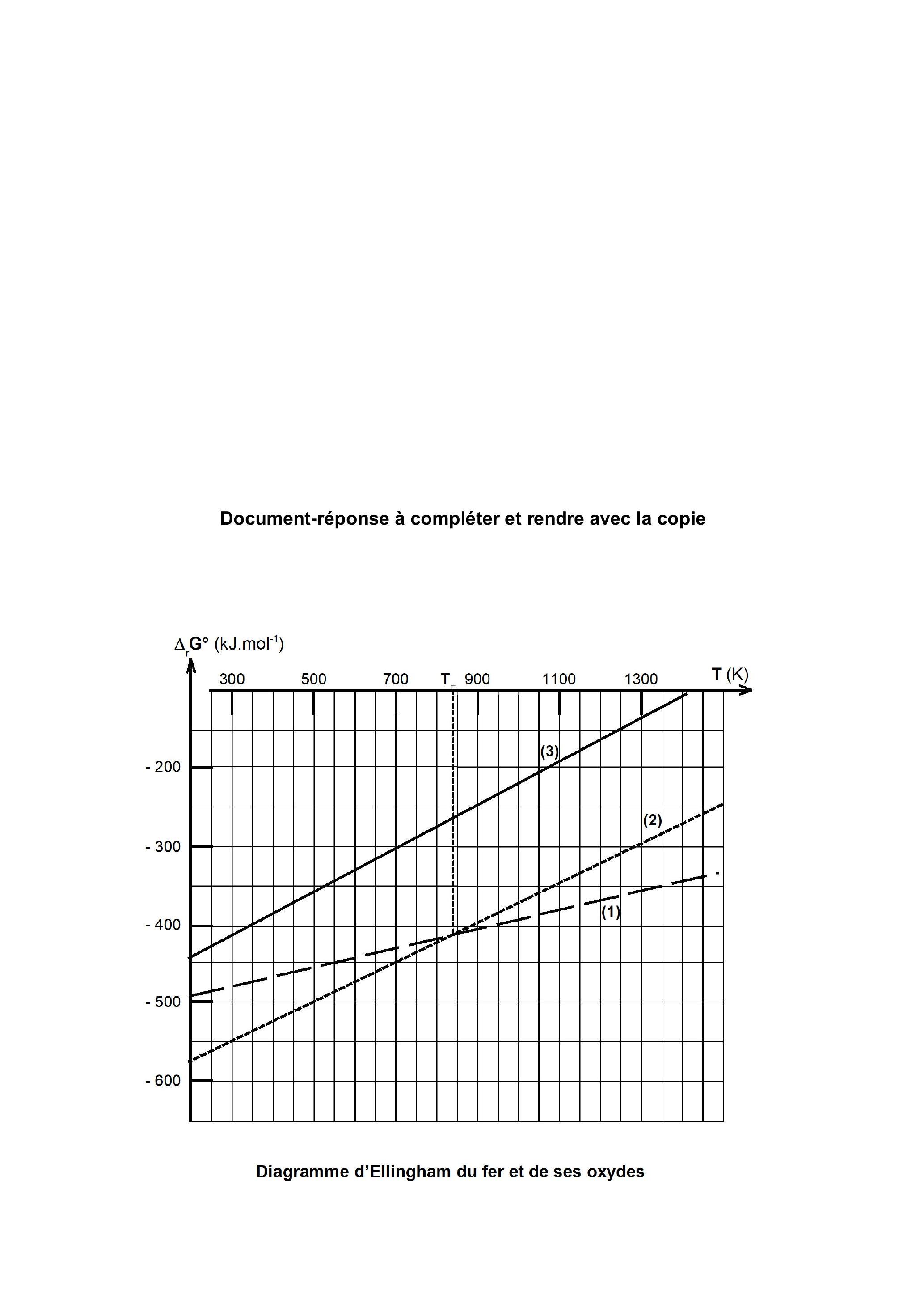 Sur le diagramme fourni en annexe (à compléter puis à rendre avec la copie), les trois droites d'Ellingham correspondantes ont été pré-tracées; leurs équations respectives en fonction de la température sont: