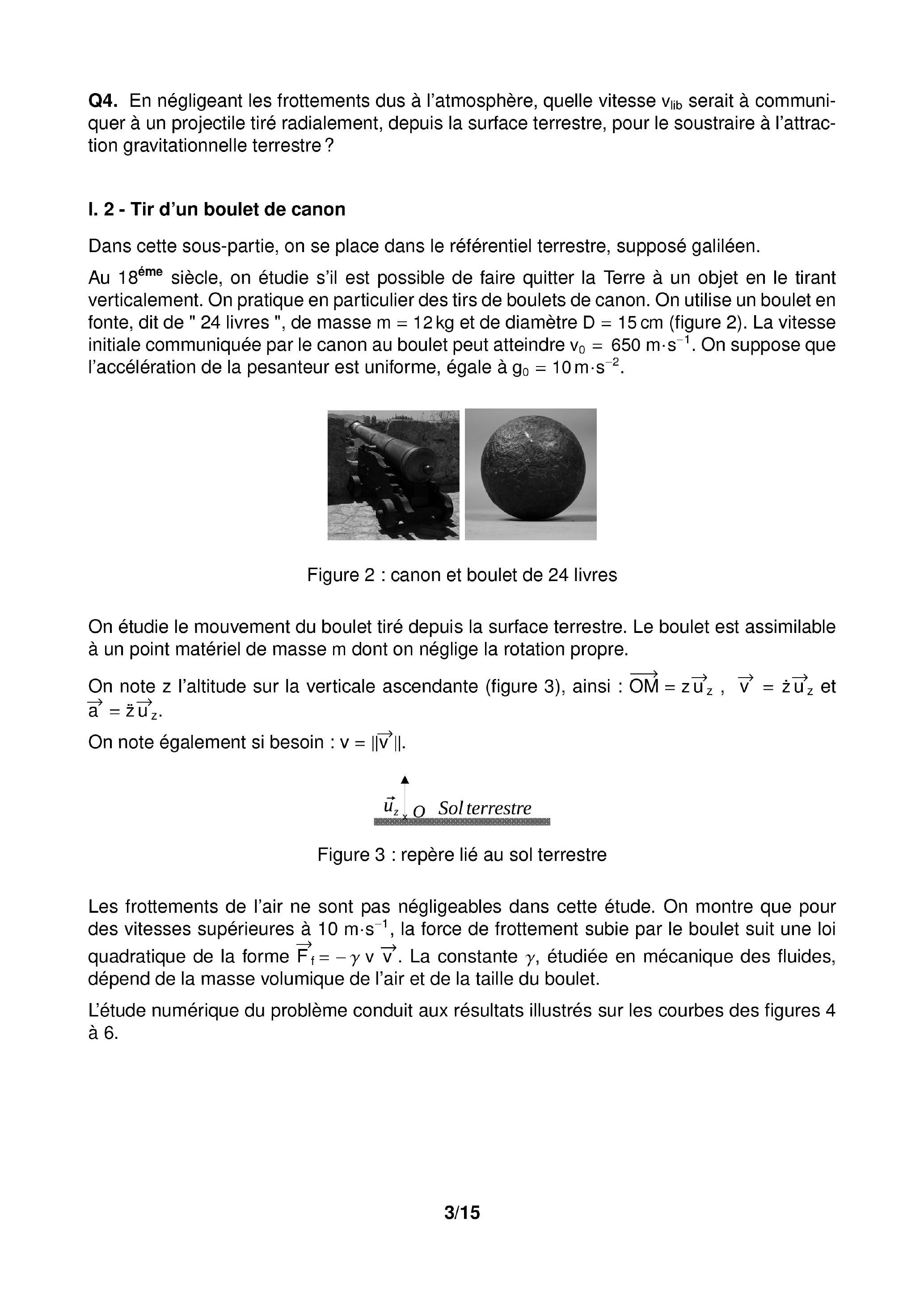 Au siècle, on étudie s'il est possible de faire quitter la Terre à un objet en le tirant verticalement. On pratique en particulier des tirs de boulets de canon. On utilise un boulet en fonte, dit de " 24 livres ", de masse et de diamètre (figure 2). La vitesse initiale communiquée par le canon au boulet peut atteindre . On suppose que l'accélération de la pesanteur est uniforme, égale à .