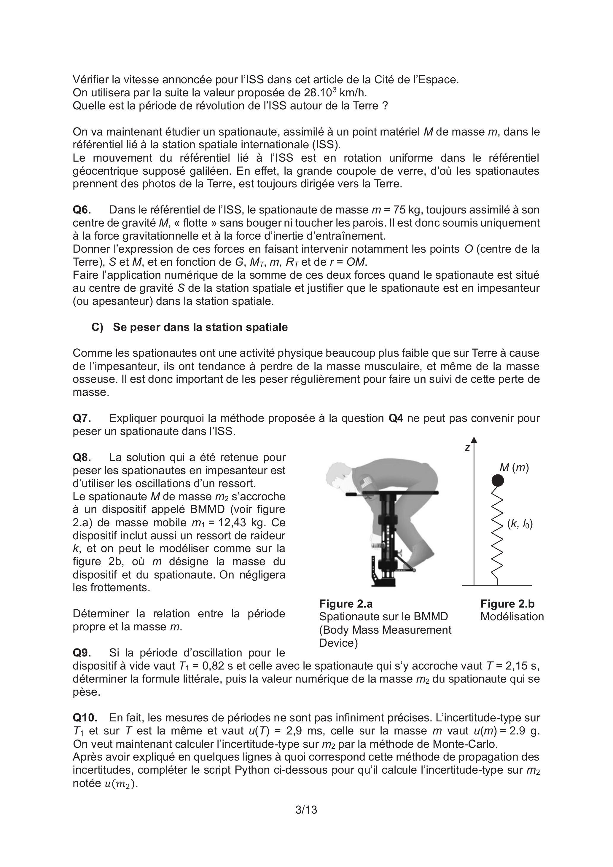 Q8. La solution qui a été retenue pour peser les spationautes en impesanteur est d'utiliser les oscillations d'un ressort. Le spationaute de masse s'accroche à un dispositif appelé BMMD (voir figure 2.a) de masse mobile . Ce dispositif inclut aussi un ressort de raideur , et on peut le modéliser comme sur la figure 2b, où désigne la masse du dispositif et du spationaute. On négligera les frottements.