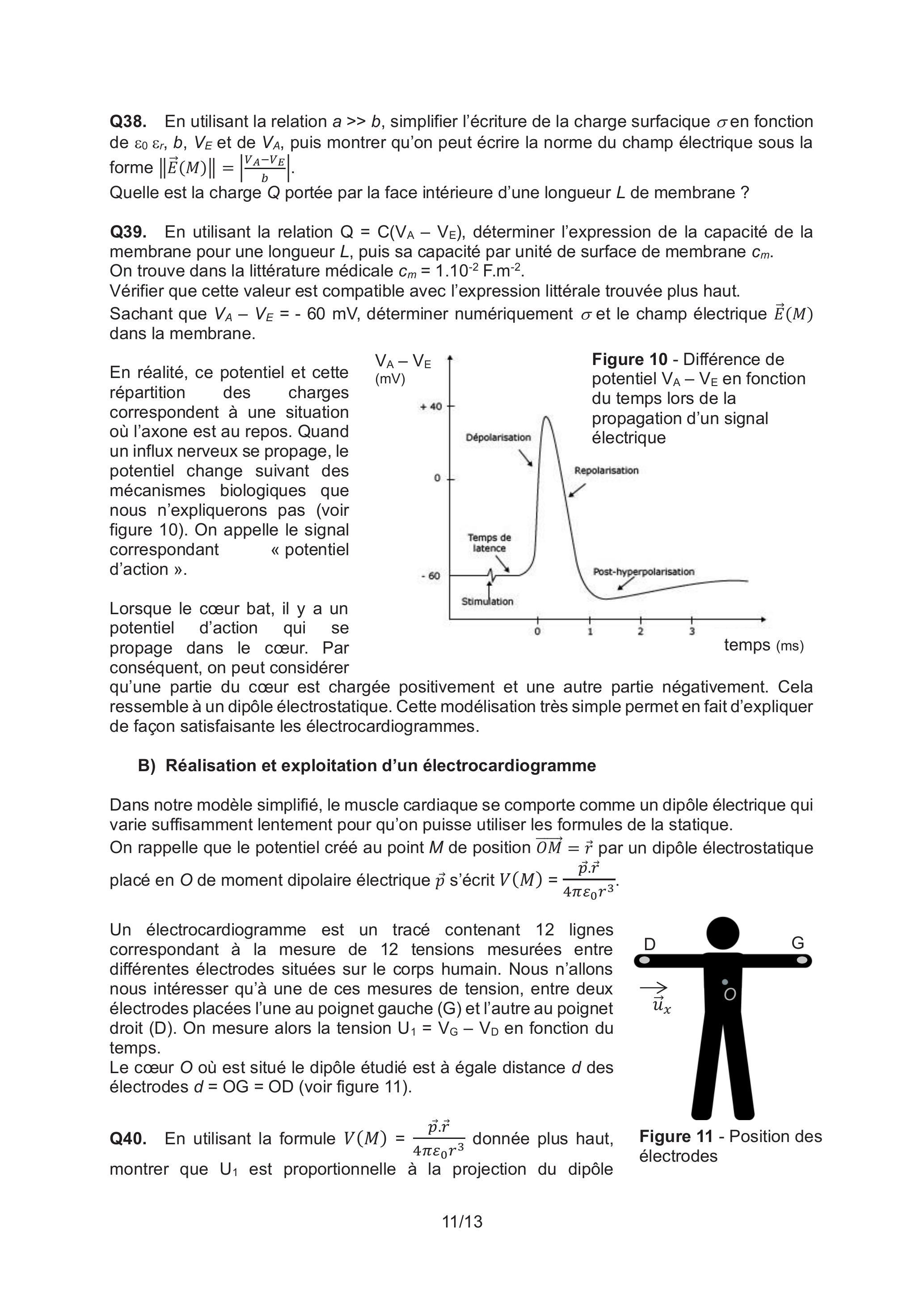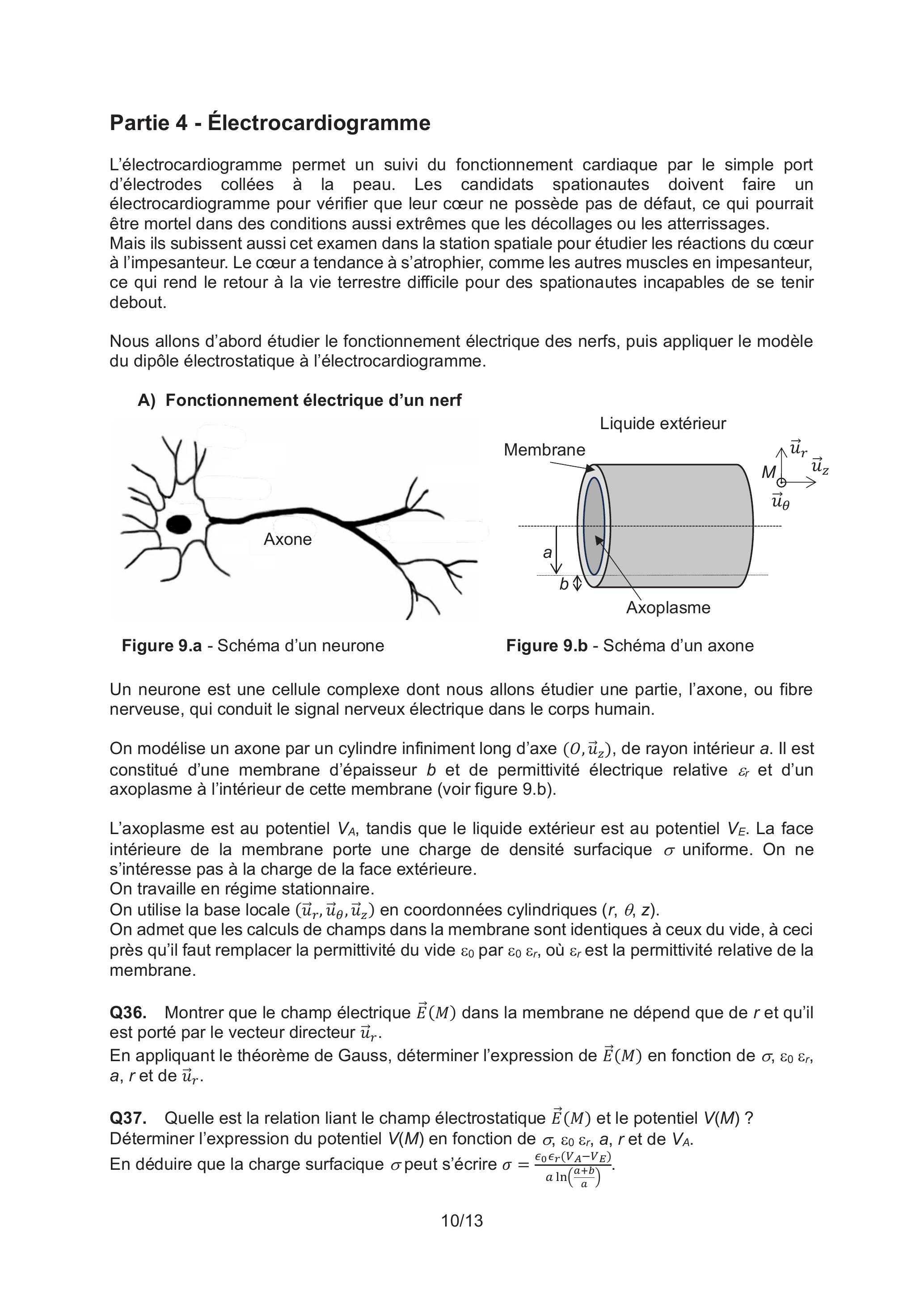 Q39. En utilisant la relation , déterminer l'expression de la capacité de la membrane pour une longueur , puis sa capacité par unité de surface de membrane . On trouve dans la littérature médicale .