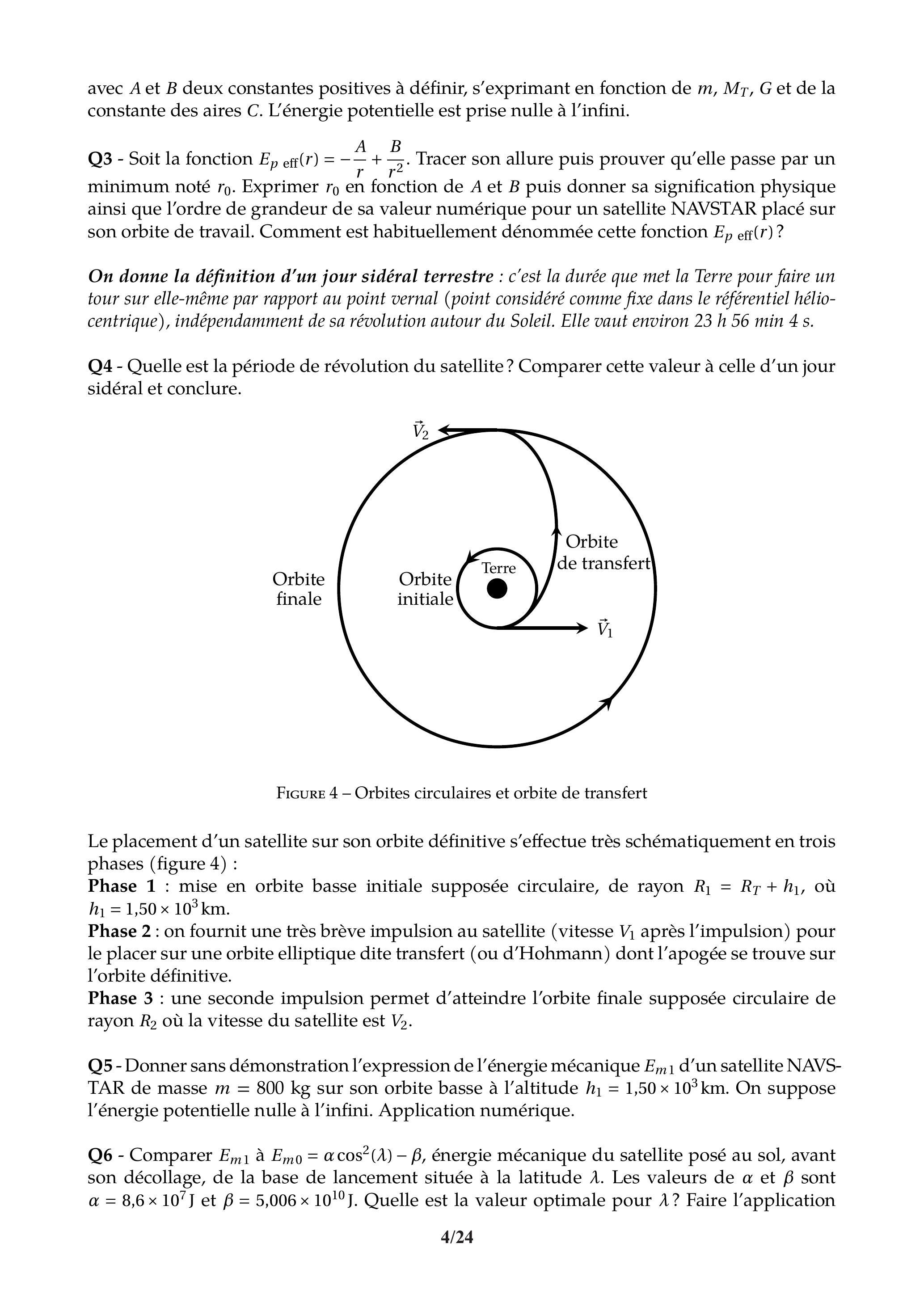 Q5 - Donner sans démonstration l'expression de l'énergie mécanique d'un satellite NAVSTAR de masse sur son orbite basse à l'altitude . On suppose l'énergie potentielle nulle à l'infini. Application numérique.