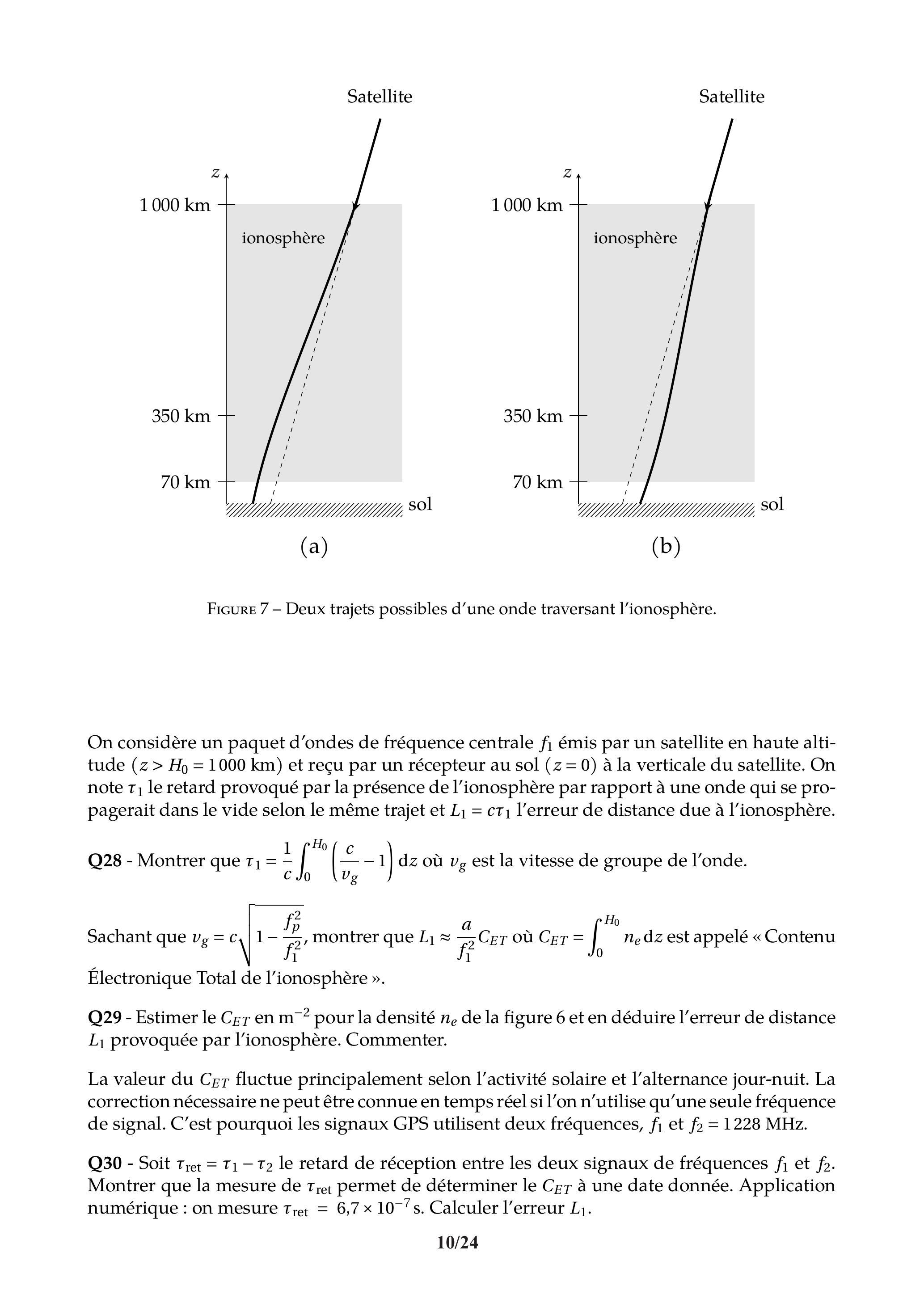Q27 - On a tracé figure 7 deux trajets possibles d'une onde électromagnétique harmonique traversant l'ionosphère et soumis à la variation de l'indice optique (le tracé pointillé correspond à la ligne droite depuis le satellite. On néglige la rotondité de la Terre). Quel est le bon tracé? Justifier.
