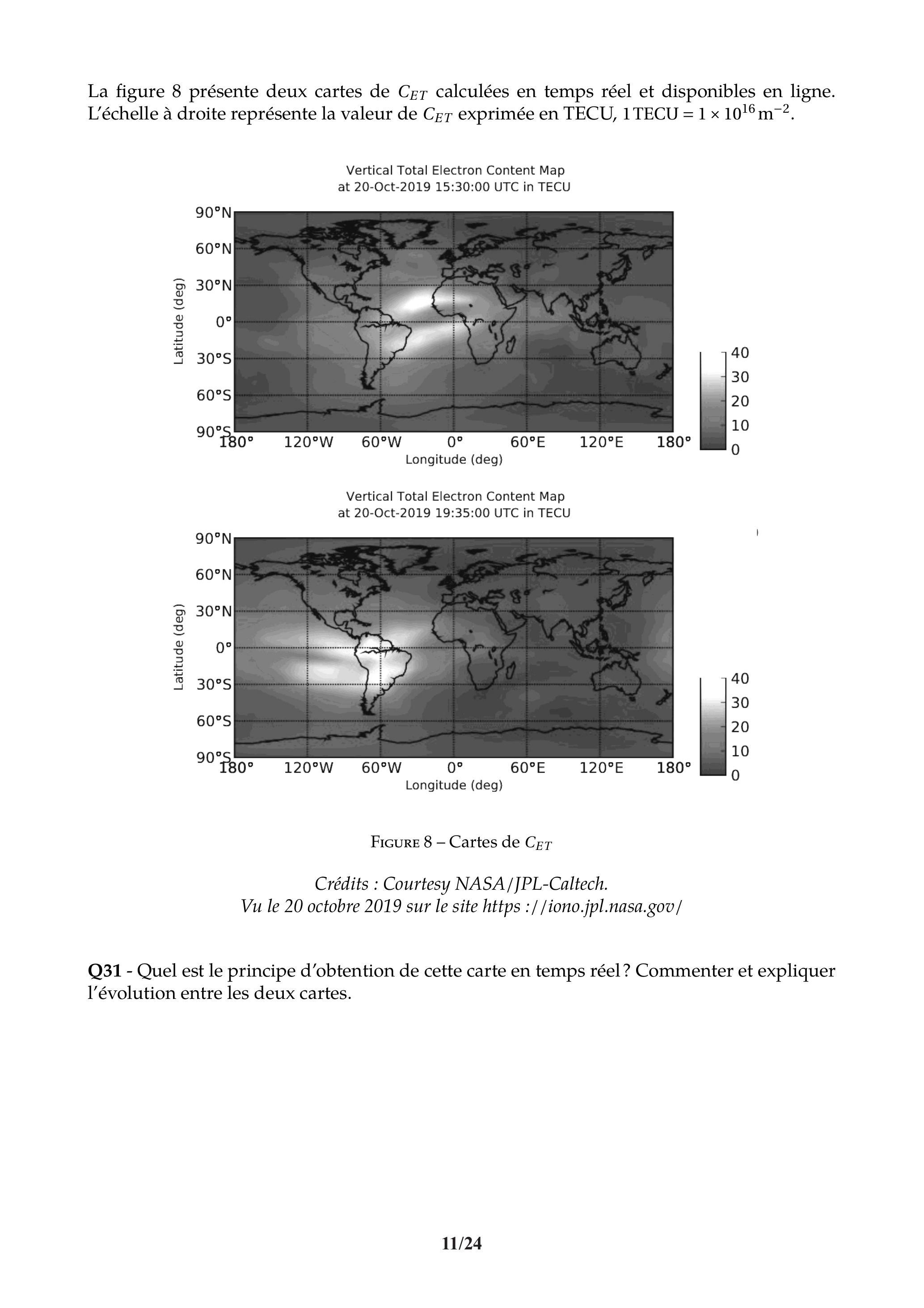 La figure 8 présente deux cartes de calculées en temps réel et disponibles en ligne. L'échelle à droite représente la valeur de exprimée en TECU, 1 TECU .