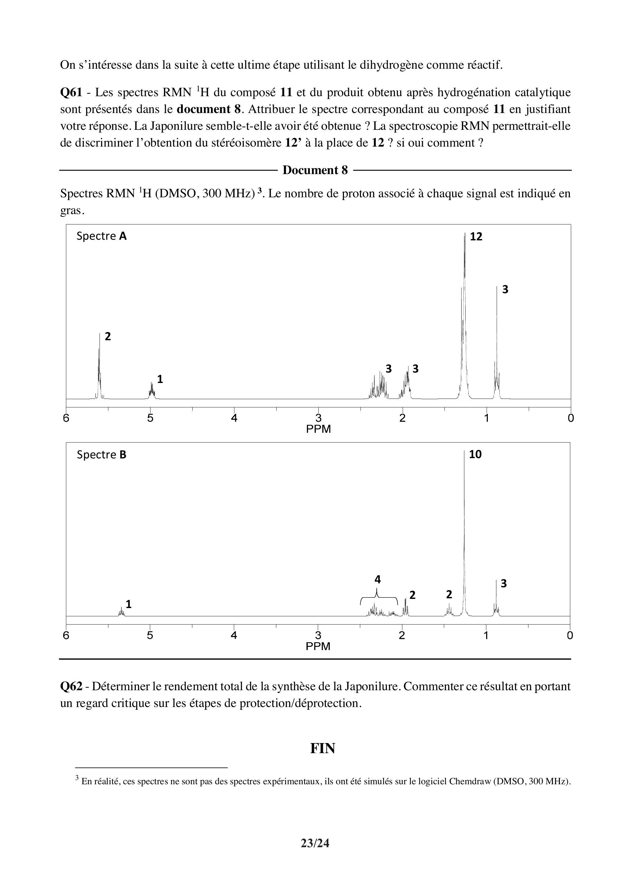 Q61 - Les spectres RMN du composé 11 et du produit obtenu après hydrogénation catalytique sont présentés dans le document 8. Attribuer le spectre correspondant au composé en justifiant votre réponse. La Japonilure semble-t-elle avoir été obtenue ? La spectroscopie RMN permettrait-elle de discriminer l'obtention du stéréoisomère 12' à la place de 12 ? si oui comment ?